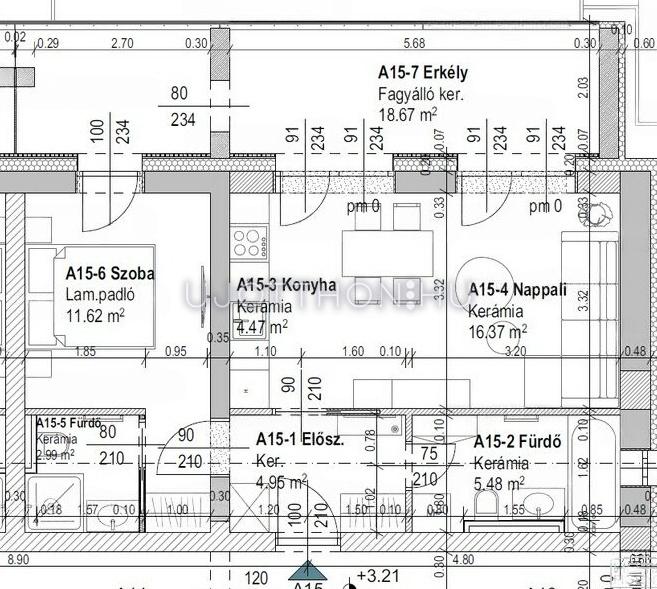Az A.L15 lakás az A épület emeletén helyezkedik el, belső udvari erkélyes kialakítással. Alapterülete 45,98 m² + 18,67 m² erkély. Kulcsrakész ára: 81.100.000 Ft.