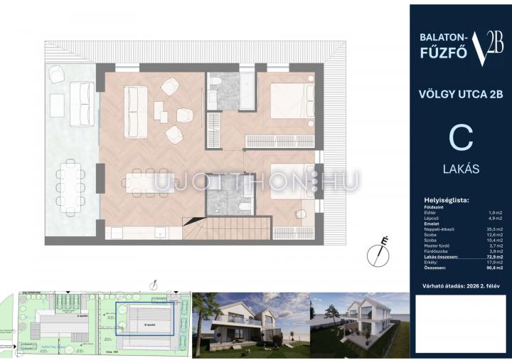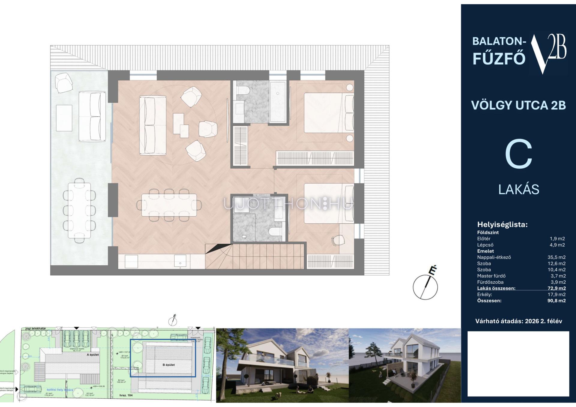 V2BC (ez a lakás): 72,9 m² lakótér + 17,9 m² délnyugati terasz, emeleti lakás, 99,5 MFt,