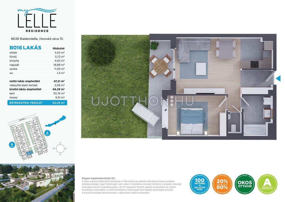 Legyen saját apartmanja a Balaton-parton, akár már 40 millió forinttól! Az újépítésű MyLelle Residence Balatonlelle szívében a Honvéd utcában, szinte a Balaton partján, mindössze 100 méterre a szabad strandtól kínál „A” energetikai besorolású apartmanokat. Az emberléptékűre tervezett, parkosított lakóparkban kétemeletes épületekben 74 darab lakás érhető el. Az alacsony fenntartást a korszerű építészeti és műszaki technológia és a megújuló energiafelhasználás (napelemek és hőszivattyús rendszer) biztosítja, így állandó ottlakásra vagy nyaralónak, de kiadásra is ideális lakásokat kínálunk – egy- és kéthálószobás kivitelben, eltérő méretű loggiával vagy terasszal, földszinti lakások esetében kertkapcsolattal. A lakók a szomszédos Lelle Hotel kertjéből percek alatt lesétálhatnak a sekély vizű szabad strandra és a hotel szolgáltatásait (játszótér, bár, szauna, kültéri fitneszpark, gyermekmedence) is ingyenesen használhatják. A lakóparktól néhány perc sétával elérhető a központ és a vasútállomás is. " "Balatonlelle a déli part egyik turisztikai központja. A városban minden megtalálható: sekély víz, szabadstrand, rengeteg jó étterem, halászcsárda, pub, pezsgő éjszakai élet, bulihelyek, szabadtéri programok, koncertek – és kerékpáros távolságra a Somogyi-dombság. Bevásárlóközpontok, óvoda, iskola, sportcentrum, szórakoztató és kulturális események biztosítják a városi életet kedvelők igényeit. A fővárosból is könnyen megközelíthető autóval és tömegközlekedéssel egyaránt. Igazi kuriózum, hogy Balatonlellén több mint 4 kilométeres partszakaszon lehet ingyen strandolni, sőt, a Napfény-strand és élményfürdő homokos partja igazi tengerparti hangulatot varázsol - mindössze néhány percre a My Lelle Residence-től.