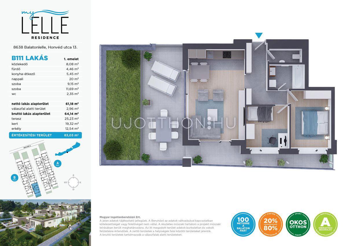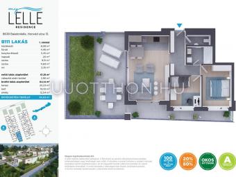 Legyen saját apartmanja a Balaton-parton, akár már 40 millió forinttól! Az újépítésű MyLelle Residence Balatonlelle szívében a Honvéd utcában, szinte a Balaton partján, mindössze 100 méterre a szabad strandtól kínál „A” energetikai besorolású apartmanokat. Az emberléptékűre tervezett, parkosított lakóparkban kétemeletes épületekben 74 darab lakás érhető el. Az alacsony fenntartást a korszerű építészeti és műszaki technológia és a megújuló energiafelhasználás (napelemek és hőszivattyús rendszer) biztosítja, így állandó ottlakásra vagy nyaralónak, de kiadásra is ideális lakásokat kínálunk – egy- és kéthálószobás kivitelben, eltérő méretű loggiával vagy terasszal, földszinti lakások esetében kertkapcsolattal. A lakóparktól néhány perc sétával elérhető a központ és a vasútállomás is.