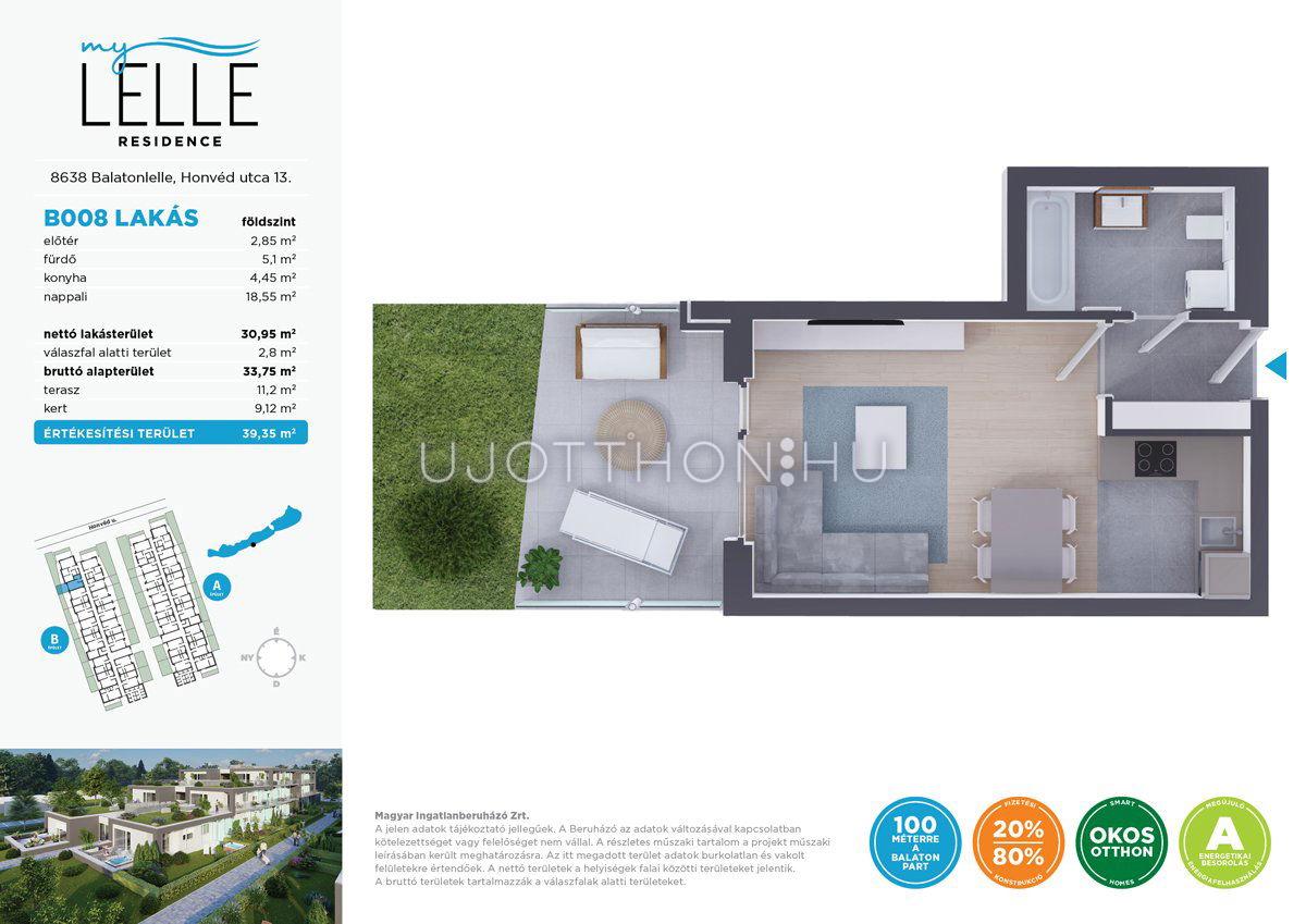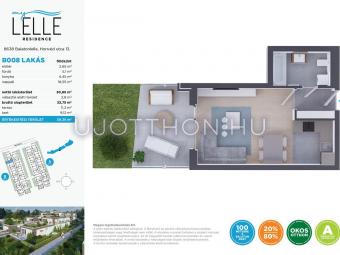 Legyen saját apartmanja a Balaton-parton, akár már 40 millió forinttól! Az újépítésű MyLelle Residence Balatonlelle szívében a Honvéd utcában, szinte a Balaton partján, mindössze 100 méterre a szabad strandtól kínál „A” energetikai besorolású apartmanokat. Az emberléptékűre tervezett, parkosított lakóparkban kétemeletes épületekben 74 darab lakás érhető el. Az alacsony fenntartást a korszerű építészeti és műszaki technológia és a megújuló energiafelhasználás (napelemek és hőszivattyús rendszer) biztosítja, így állandó ottlakásra vagy nyaralónak, de kiadásra is ideális lakásokat kínálunk – egy- és kéthálószobás kivitelben, eltérő méretű loggiával vagy terasszal, földszinti lakások esetében kertkapcsolattal. A lakóparktól néhány perc sétával elérhető a központ és a vasútállomás is.