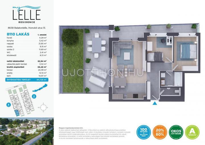 Legyen saját apartmanja a Balaton-parton, akár már 40 millió forinttól! Az újépítésű MyLelle Residence Balatonlelle szívében a Honvéd utcában, szinte a Balaton partján, mindössze 100 méterre a szabad strandtól kínál „A” energetikai besorolású apartmanokat. Az emberléptékűre tervezett, parkosított lakóparkban kétemeletes épületekben 74 darab lakás érhető el. Az alacsony fenntartást a korszerű építészeti és műszaki technológia és a megújuló energiafelhasználás (napelemek és hőszivattyús rendszer) biztosítja, így állandó ottlakásra vagy nyaralónak, de kiadásra is ideális lakásokat kínálunk – egy- és kéthálószobás kivitelben, eltérő méretű loggiával vagy terasszal, földszinti lakások esetében kertkapcsolattal. A lakóparktól néhány perc sétával elérhető a központ és a vasútállomás is.