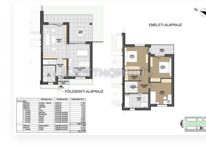 A lakások földszint + emelet kialakításúak, hagyományos falazattal, külső hőszigeteléssel, lapostetős kivitelben épültek. Gondosan válogatott, prémium anyaghasználatuk és magas műszaki tartalmuk valódi családi házas komfortot és modern életérzést nyújt.