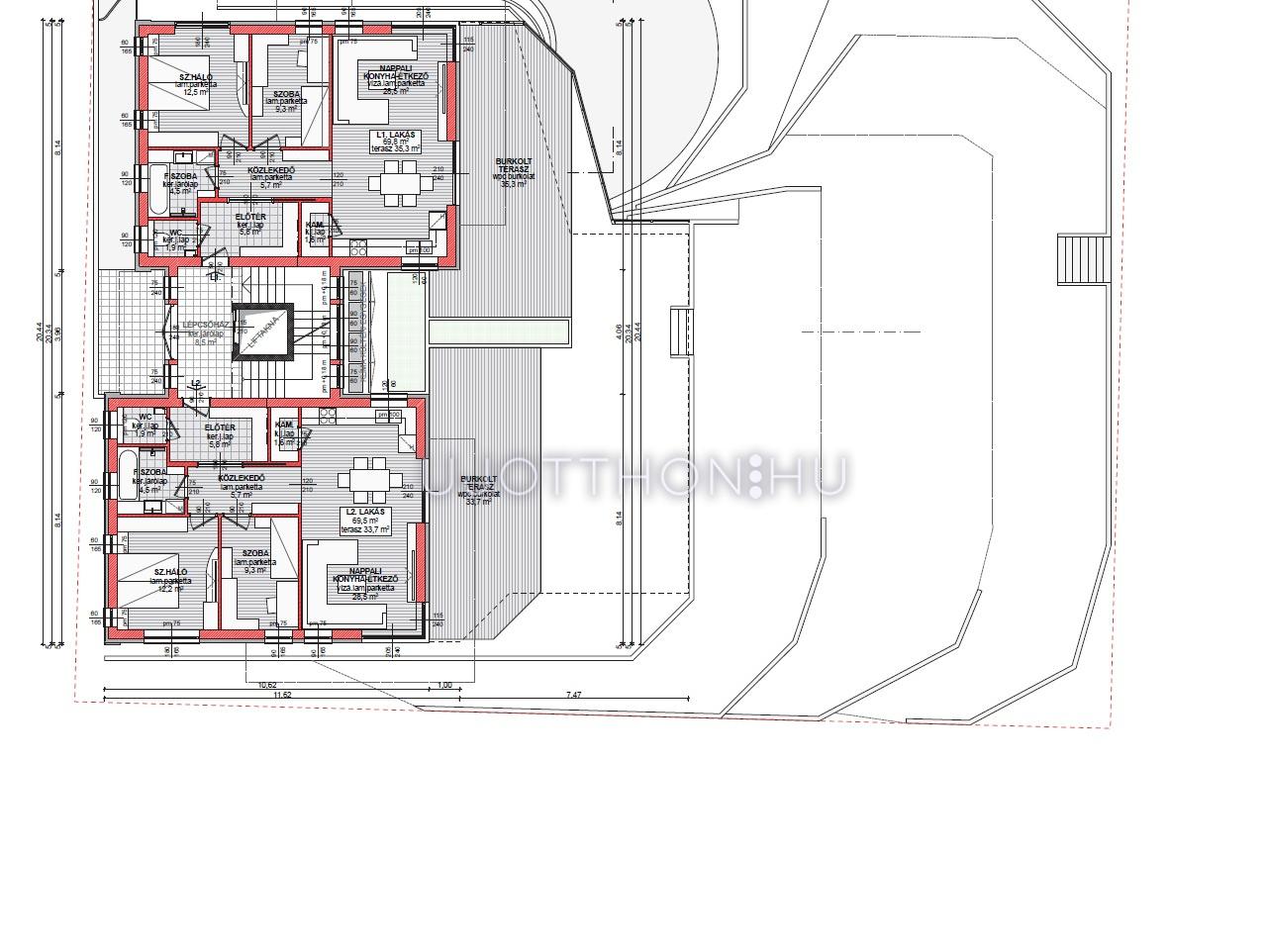 1. lakás :70nm,nappali+2 háló, +35.3nm-es terasz,