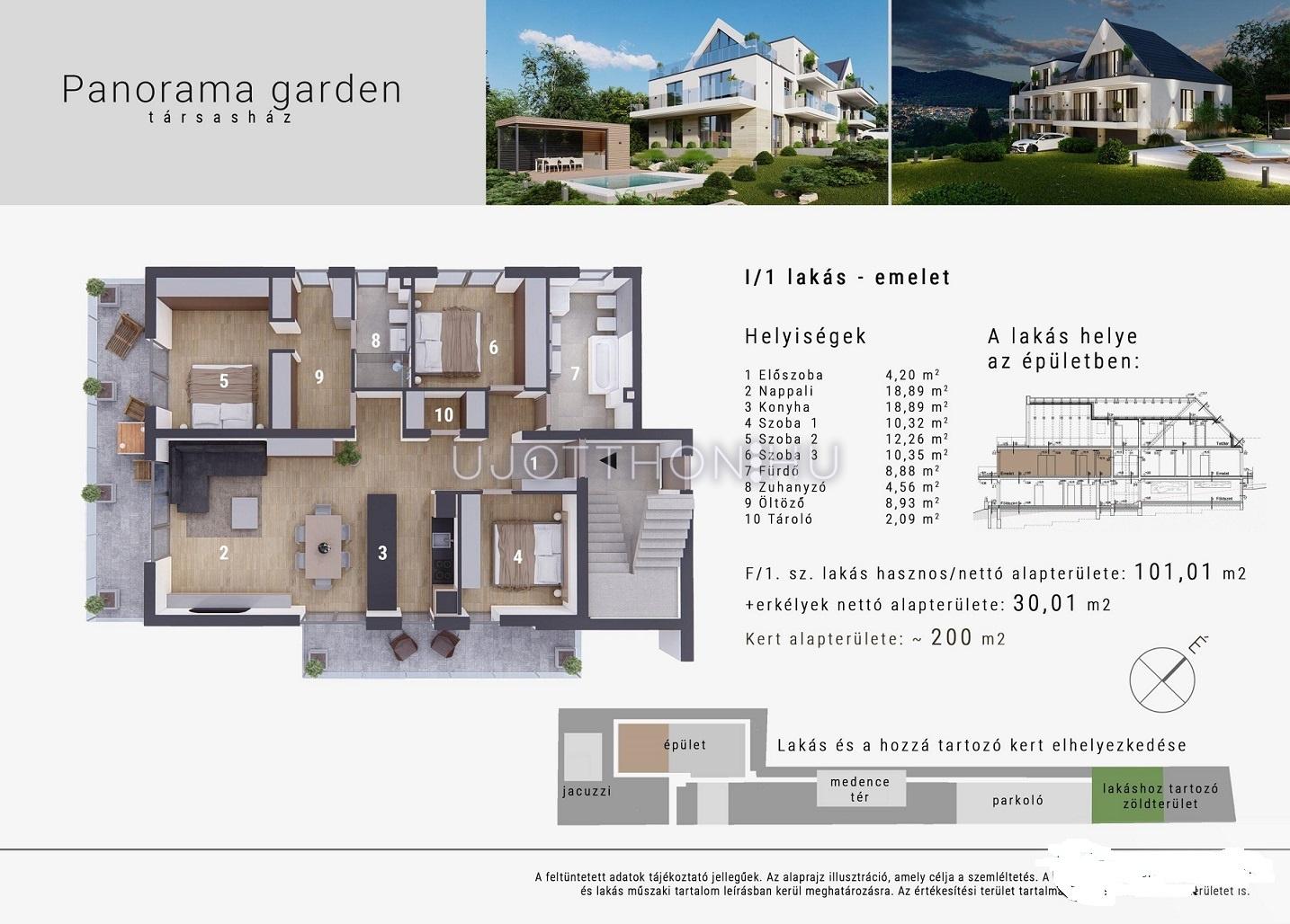 2. lakás 1. emelet: nettó: 101nm + 30nm terasz + 200nm saját kert,