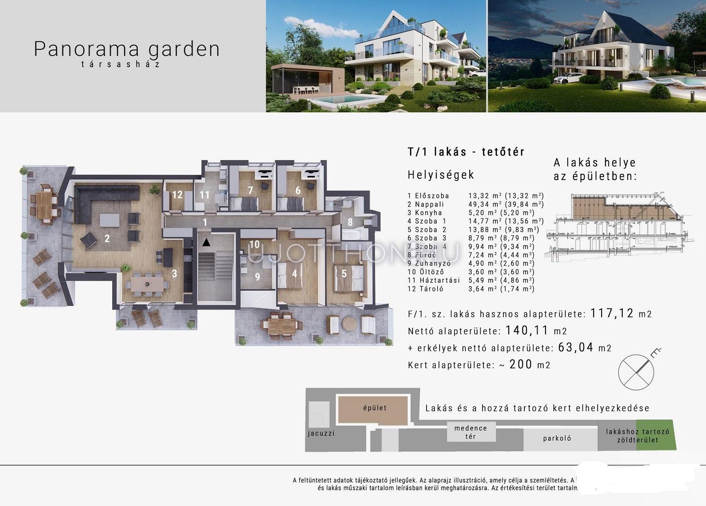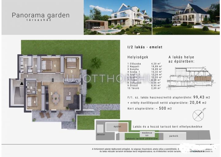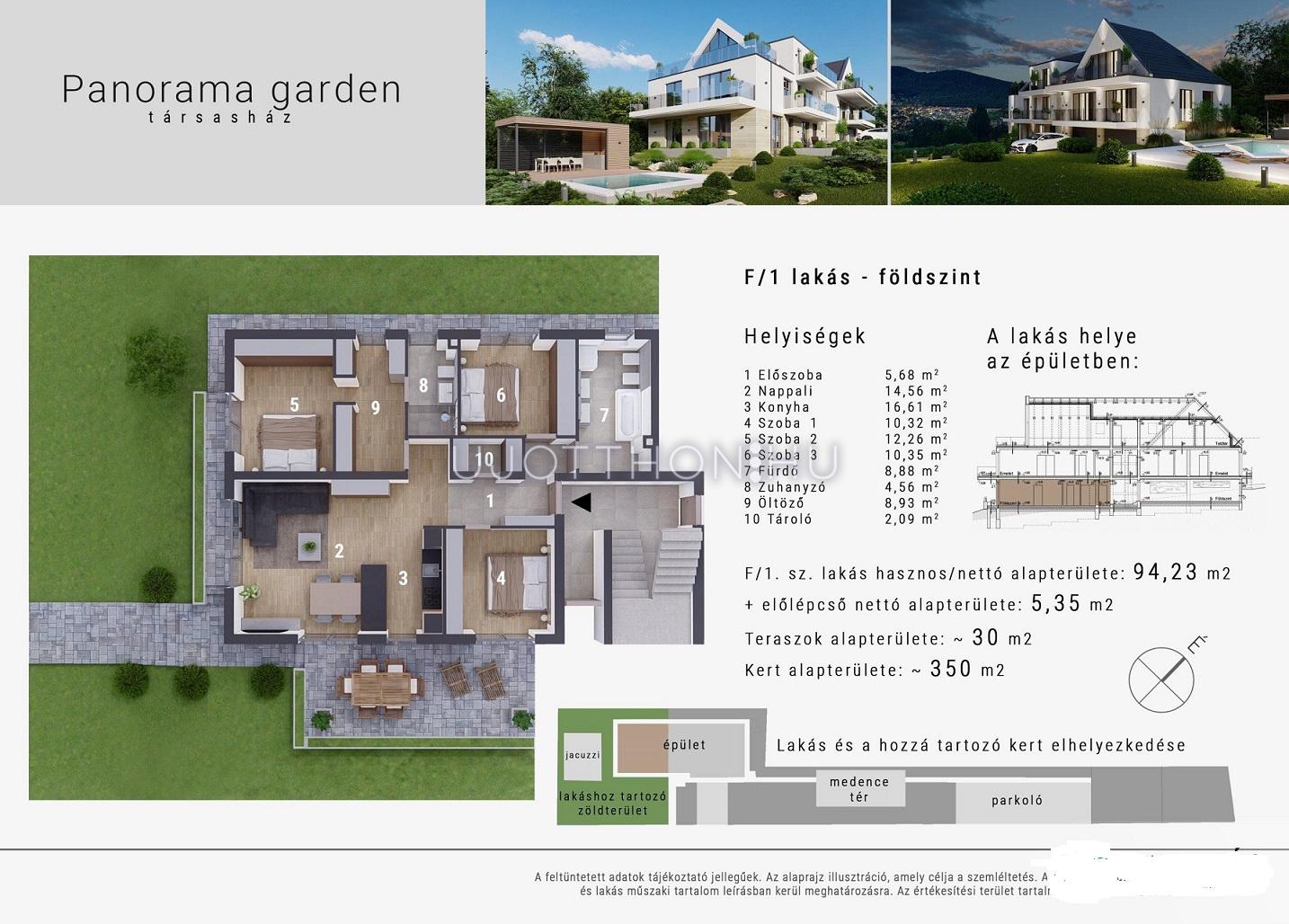 1. fszt. lakás:nettó: 94.23nm + 5,35nm előtér+ 30nm terasz + 350nm saját kert,