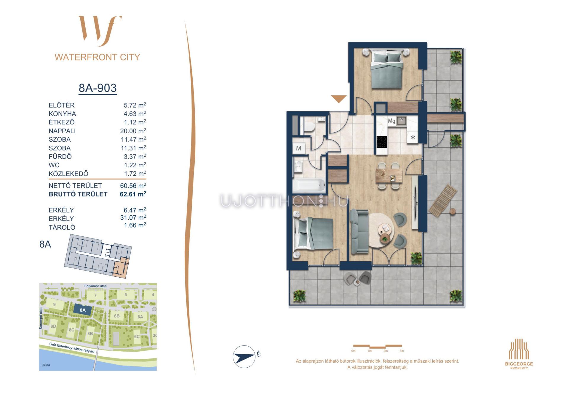 A Waterfront City egy új, modern városnegyed a 3. kerületben, ahol a természet közelsége és a városi kényelem tökéletes egyensúlyban van. A Duna-part közvetlen szomszédságában elhelyezkedő fejlesztés különleges atmoszférát kínál: a sétányt új épületek határolják, üzletekkel, kávézókkal és szolgáltatásokkal, amelyek élhető közösségi teret teremtenek.