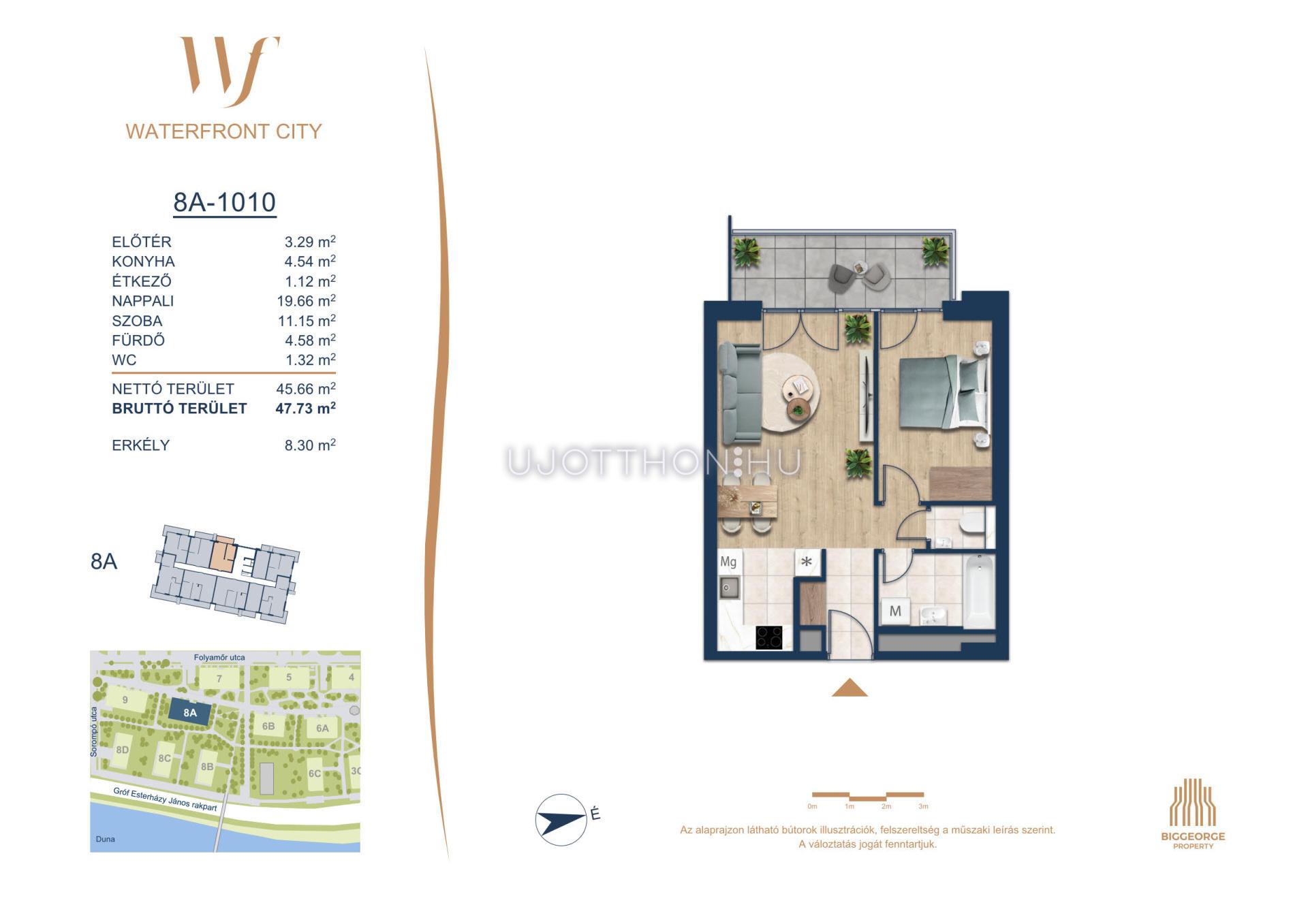 A Waterfront City egy új, modern városnegyed a 3. kerületben, ahol a természet közelsége és a városi kényelem tökéletes egyensúlyban van. A Duna-part közvetlen szomszédságában elhelyezkedő fejlesztés különleges atmoszférát kínál: a sétányt új épületek határolják, üzletekkel, kávézókkal és szolgáltatásokkal, amelyek élhető közösségi teret teremtenek.