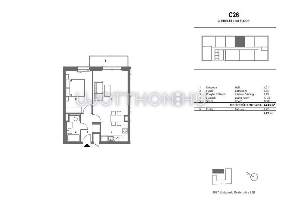 2 szobás 44 m2-es Lakás M76 Projekt - Budapest IX. kerület, Ferencváros, Mester utca 76/B