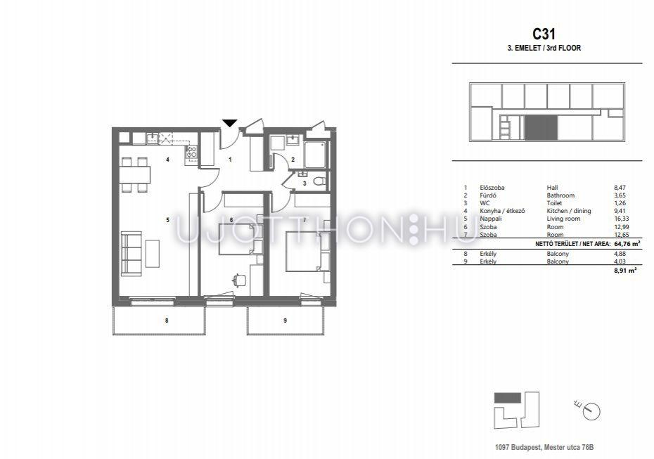 3 szobás 65 m2-es Lakás M76 Projekt - Budapest IX. kerület, Ferencváros, Mester utca 76/B