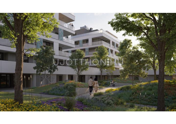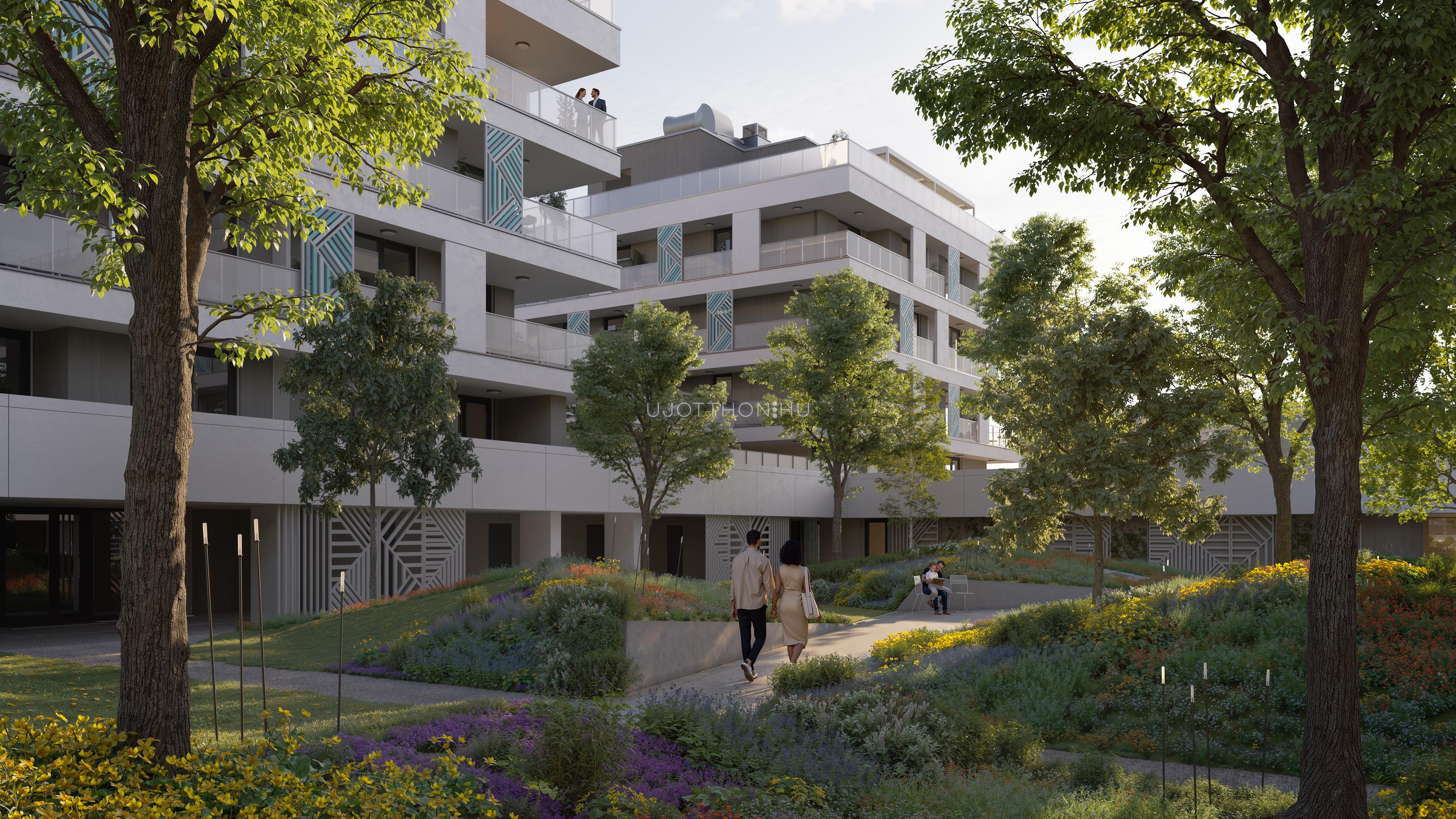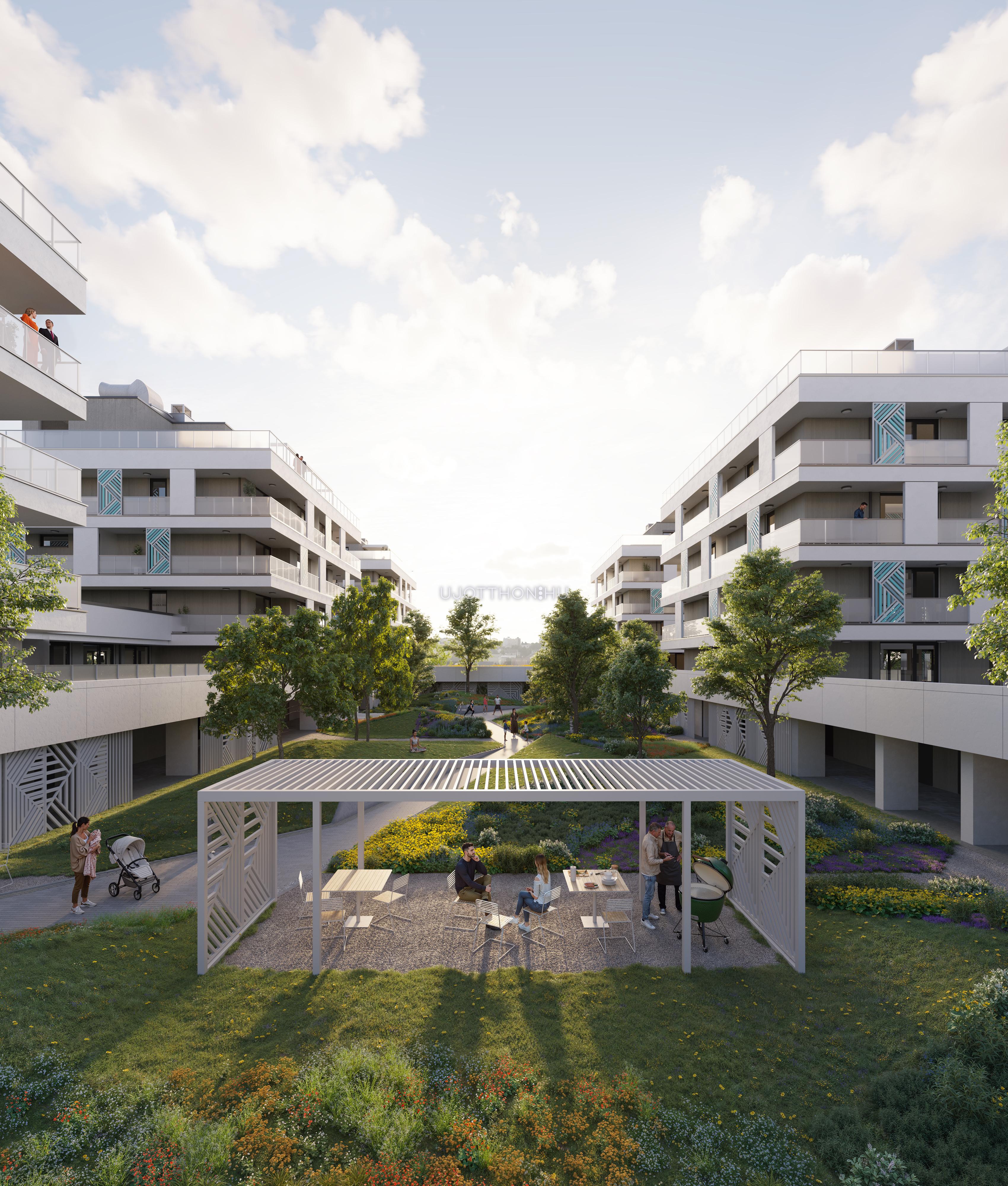 A kifinomult formavilágú épületekből álló lakópark impozáns, fákkal övezett belső kertje és igényes, családbarát közösségi terei garantálják a nyugodt, inspiráló környezetet. Mindez csupán karnyújtásnyira található számtalan szórakozási, sportolási és vásárlási lehetőségtől.