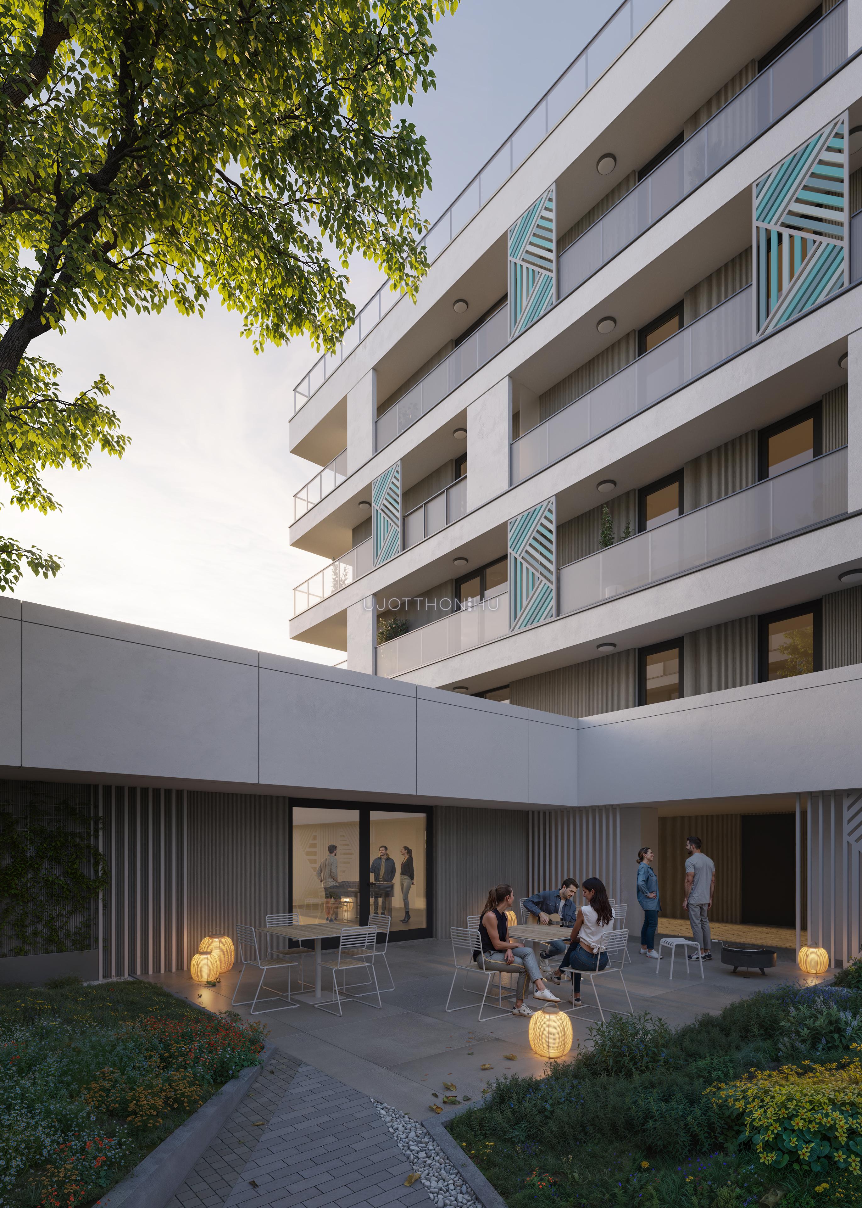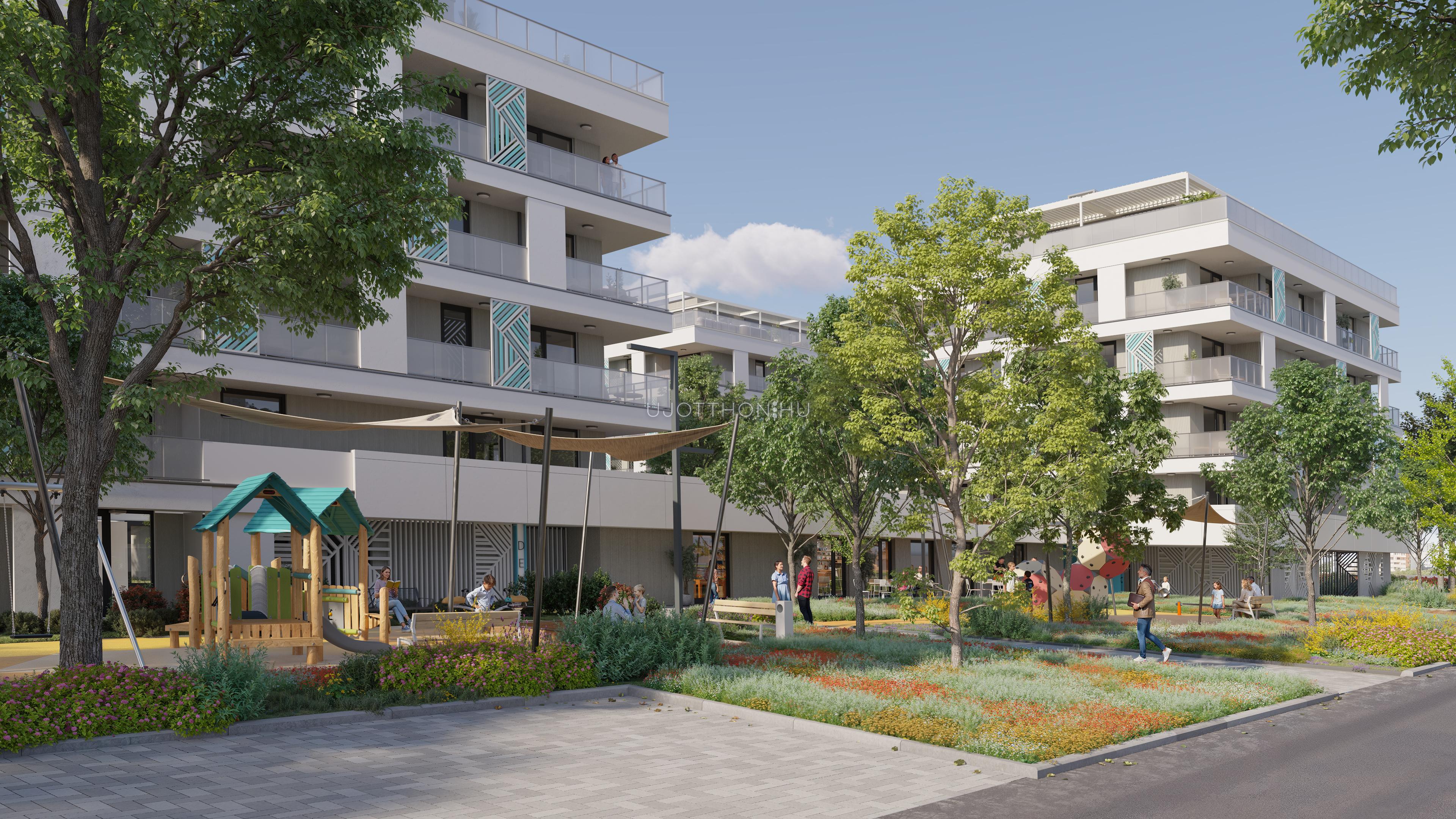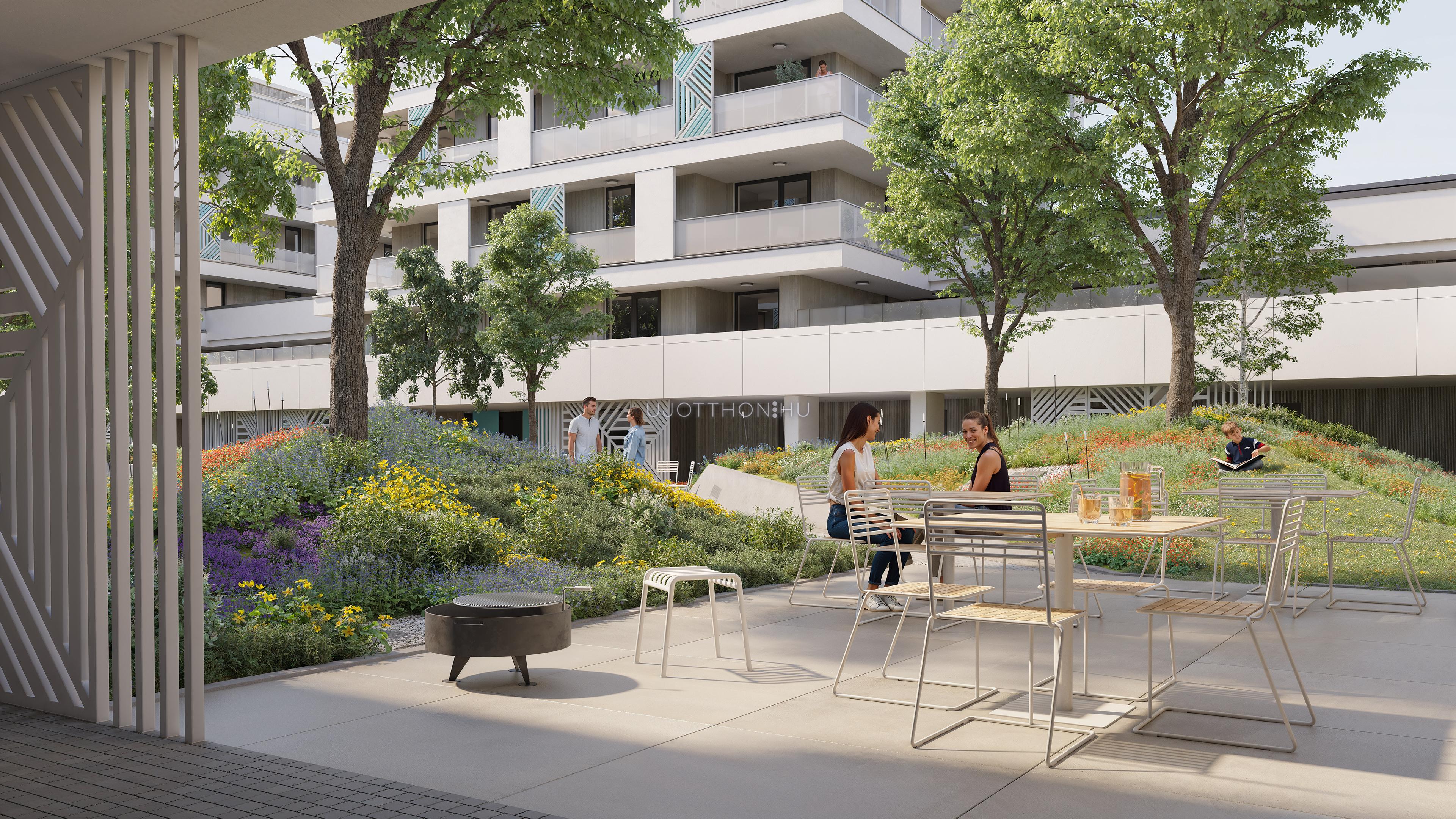 A kifinomult formavilágú épületekből álló lakópark impozáns, fákkal övezett belső kertje és igényes, családbarát közösségi terei garantálják a nyugodt, inspiráló környezetet. Mindez csupán karnyújtásnyira található számtalan szórakozási, sportolási és vásárlási lehetőségtől.