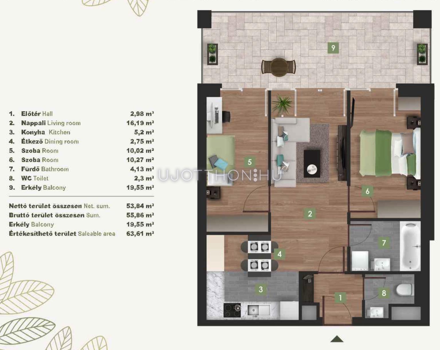 Erkély méret: 19.55 m2