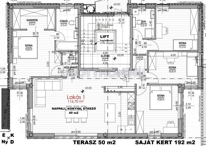 FSZT.: 142 m2 (50 m2 terasz 1/2 méretének a beszámítása mellett. A terasz nélküli nettó alapterület 117 m2), DNY-i, 5 szobás, 2 fürdőszobás, 2 db teremgarázs hely (+10 Mft/db), 5,5 m2 tárolóval (+5,5 Mft) és 192 m2 saját kert.