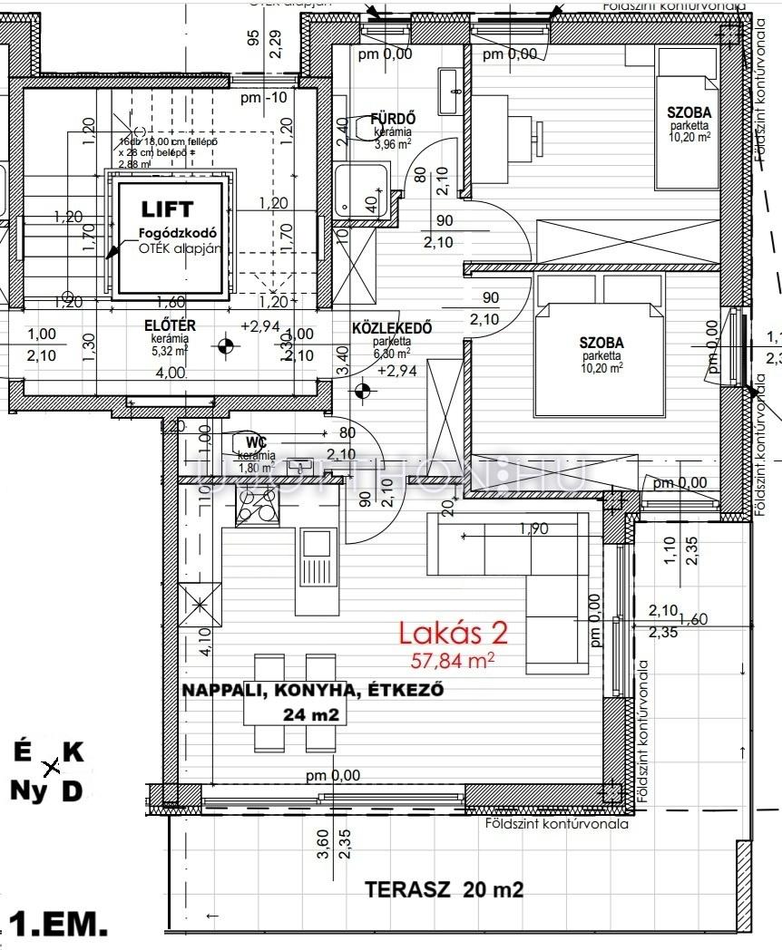 1.E.: 2 db 68 m2-es (20 m2 terasz 1/2 méretének a beszámítása mellett. A terasz nélküli nettó alapterület 58 m2), DNY-i, 3 szobás, 2 db teremgarázs hely (+10 Mft/db), és 4,5 m2 tárolóval (+4,5 Mft)