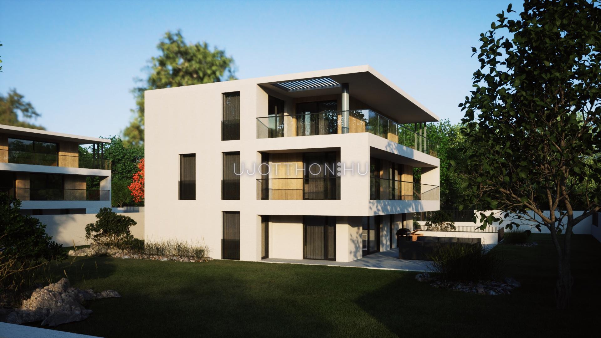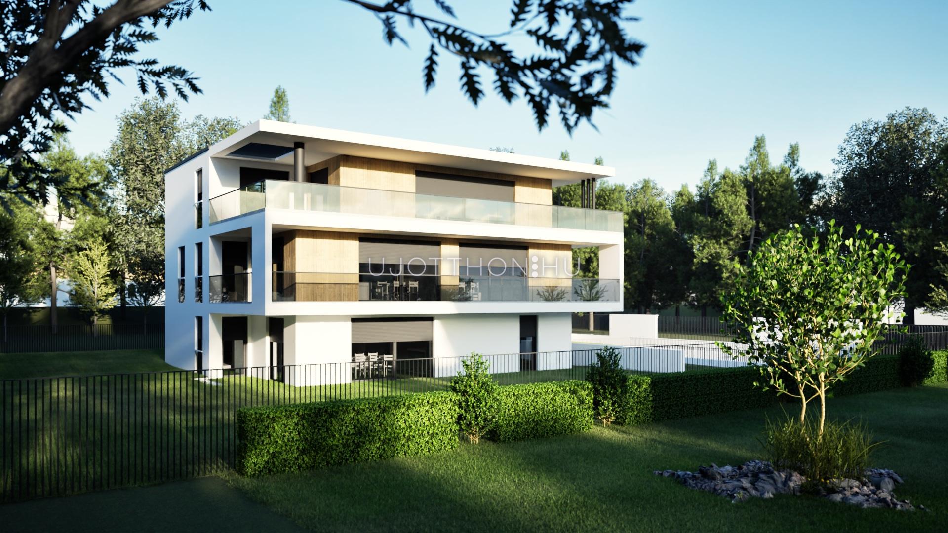 FSZT.: 142 m2 (50 m2 terasz 1/2 méretének a beszámítása mellett. A terasz nélküli nettó alapterület 117 m2), DNY-i, 5 szobás, 2 fürdőszobás, 2 db teremgarázs hely (+10 Mft/db), 5,5 m2 tárolóval (+5,5 Mft) és 192 m2 saját kert.