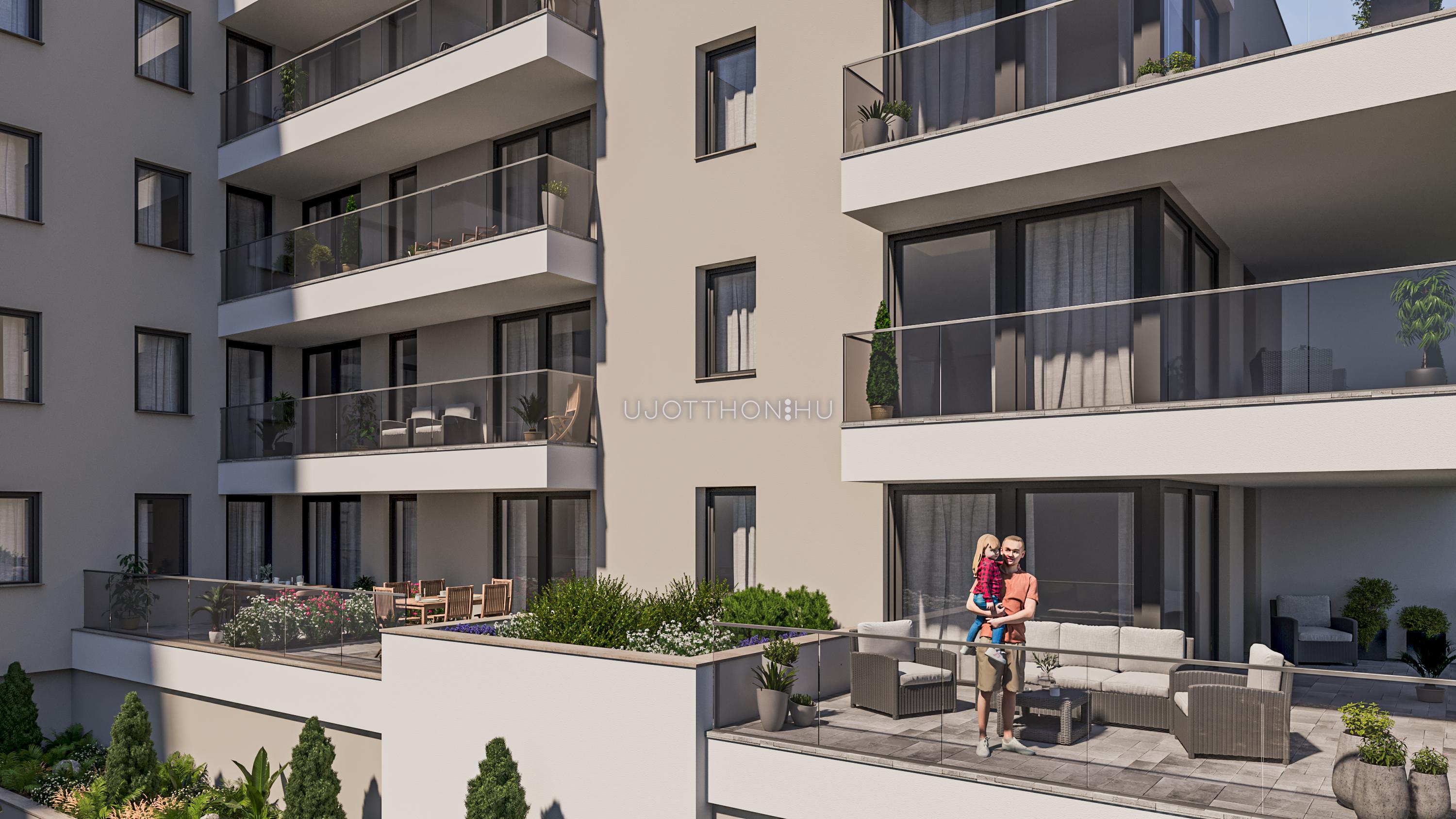 Az erkélyek fagyálló, csúszásmentes burkolatot kapnak, egyedi, lézervágott fémkorláttal.