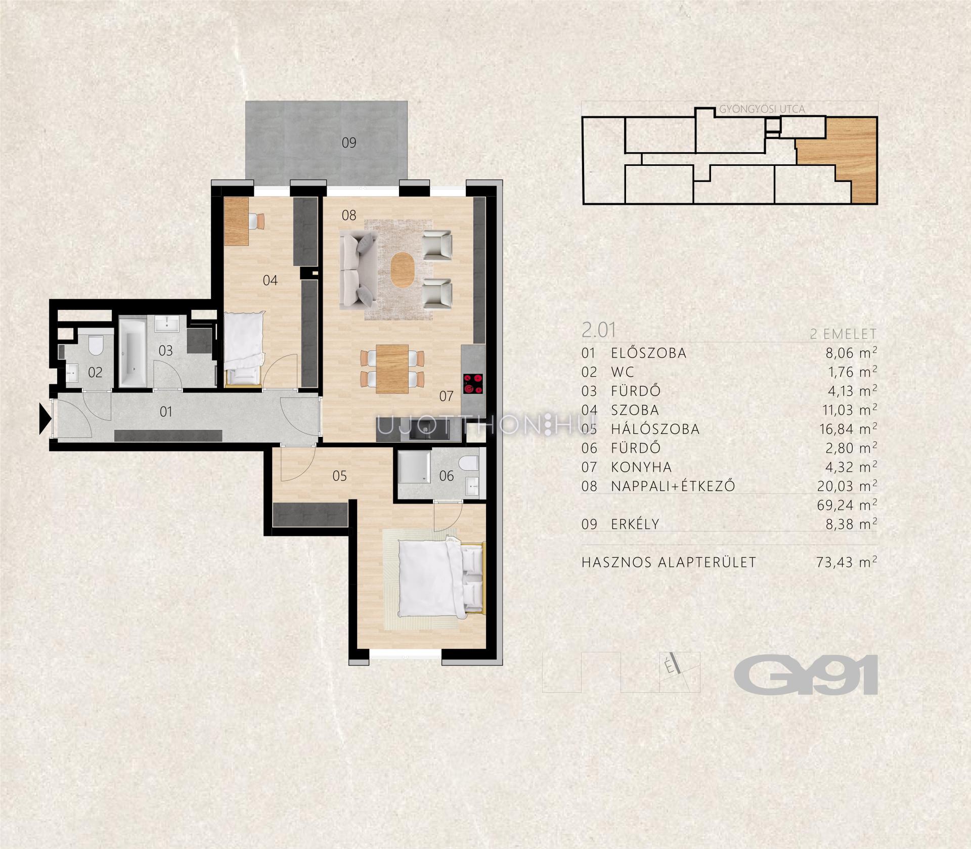 3 szobás 69 m2-es Lakás Gyöngyösi 91 - Budapest XIII. kerület, Angyalföld
