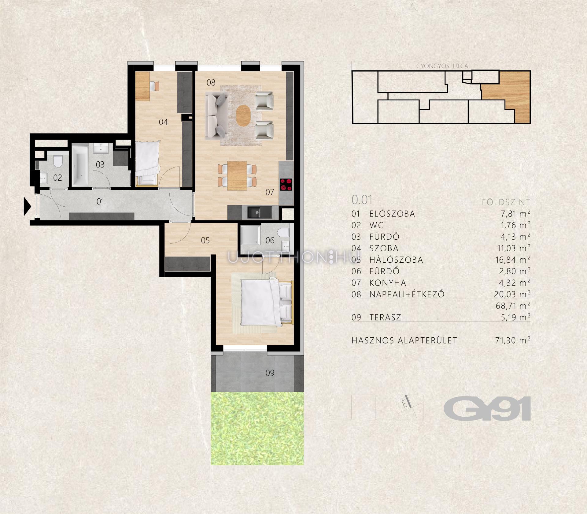 A Gyöngyösi utca kiváló infrastruktúrával rendelkezik, a közelben minden megtalálható, ami a kényelmes élethez szükséges (vásárlási lehetőségek, közlekedés, szolgáltatások).