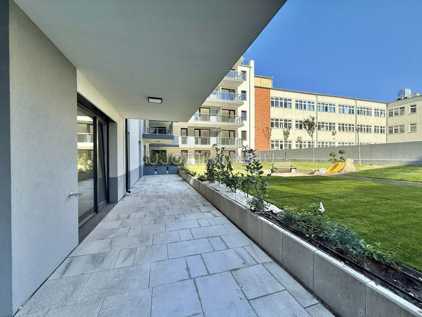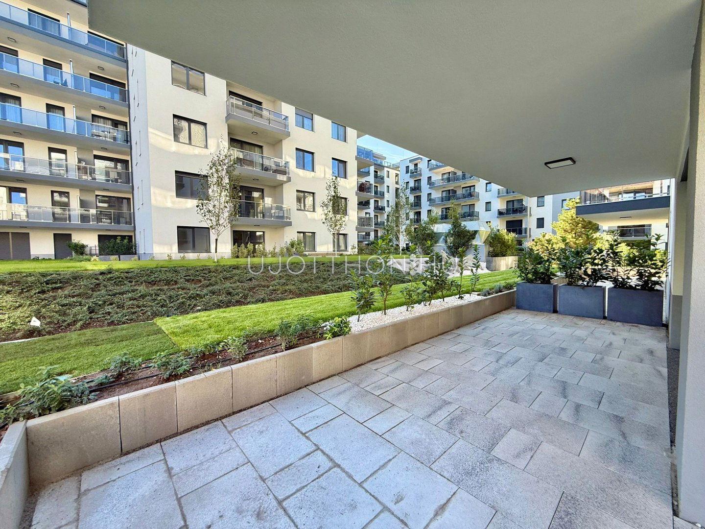 Kert szintjén (1. emeleten, a teremgarázs tetején van kialakítva a belső kert)