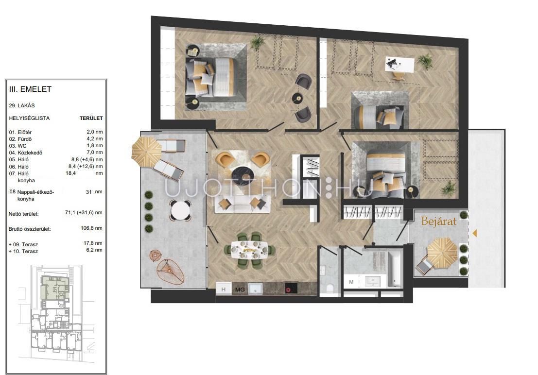 - 106,8 nm alapterületű, 23,6 nm-es terasszal