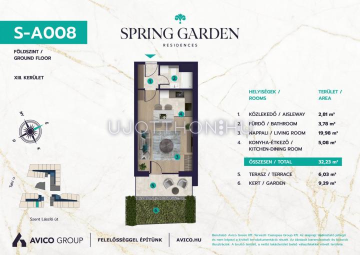 A XIII. kerület egyre fejlődő részén, Angyalföldön kerül megépítésre Társaságunk legújabb fejlesztése a „SPRING GARDEN” fantázianevű lakóegyüttes, mely a Szent László út csendes, kisvárosias övezetében található 218 lakásos társasház. A Rákos-patak mentén végig futó zöld sáv, illetve a Városliget relatív közelsége számos kikapcsolódási lehetőséget biztosít.