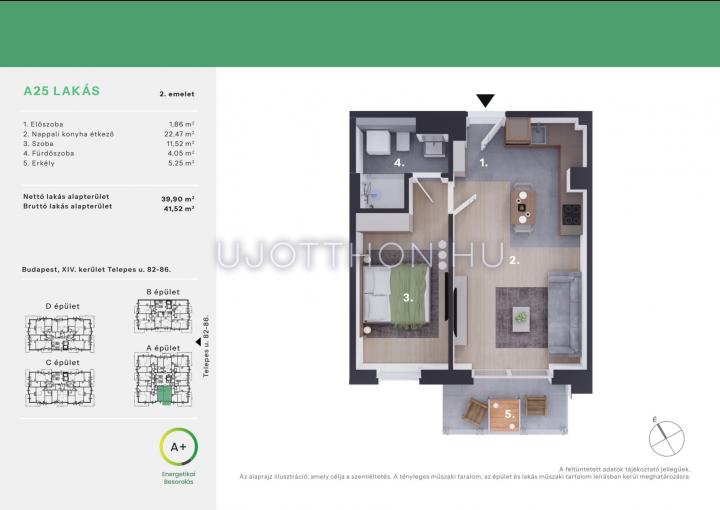 Az alaprajzokon ábrázolt berendezési tárgyak és bútorok, a burkolatok megjelenése nem képezi a szerződés tárgyát. A pontos felszereltségről a műszaki leírásban olvashat bővebben.