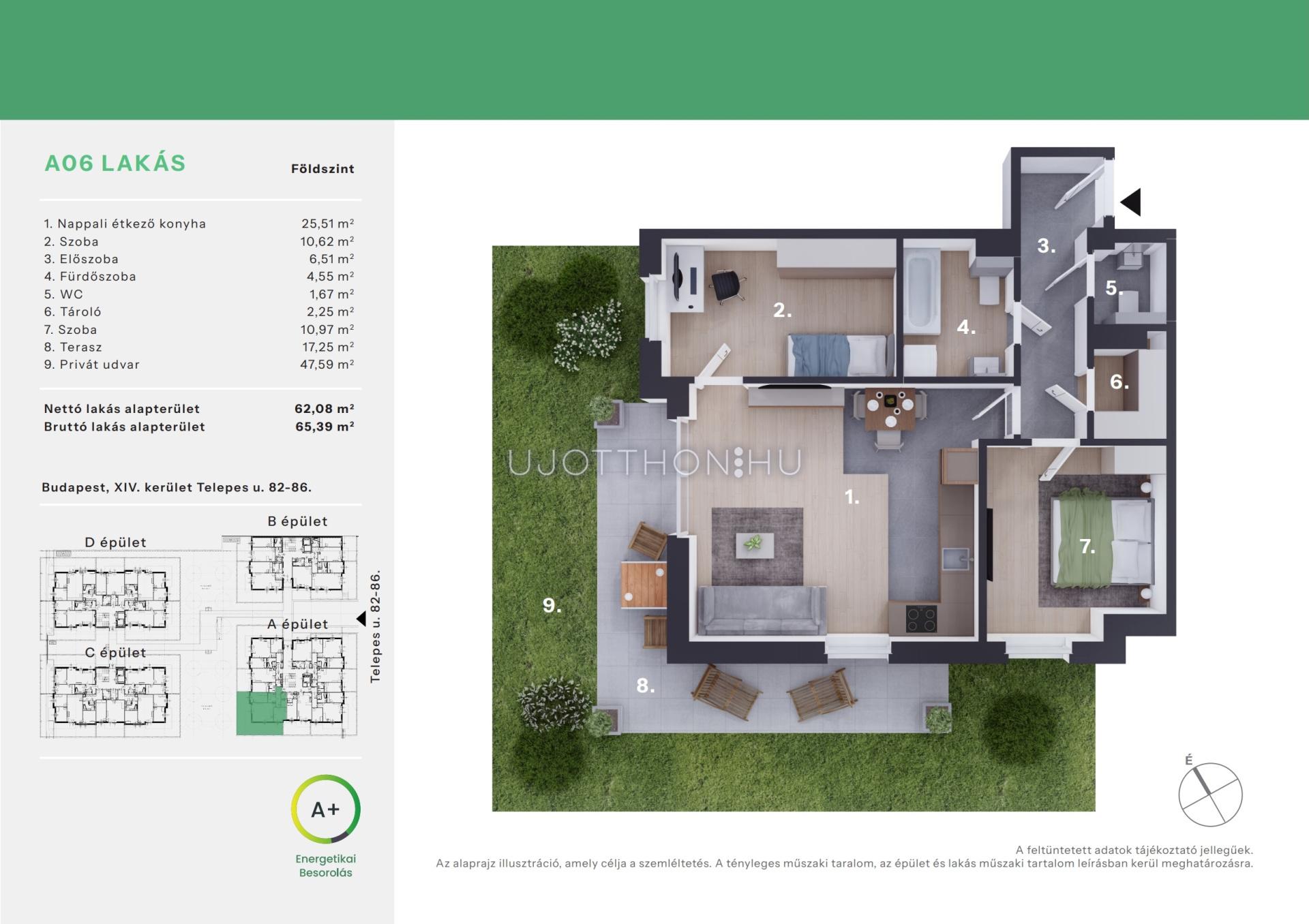Az alaprajzokon ábrázolt berendezési tárgyak és bútorok, a burkolatok megjelenése nem képezi a szerződés tárgyát. A pontos felszereltségről a műszaki leírásban olvashat bővebben.