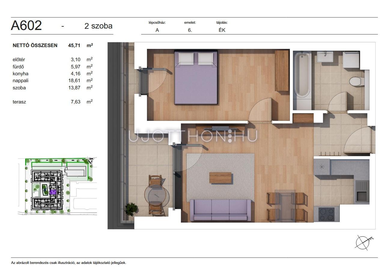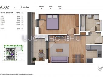 Az ingatlan nettó alapterülete 45,71 m² + 7,63 m² terasz.