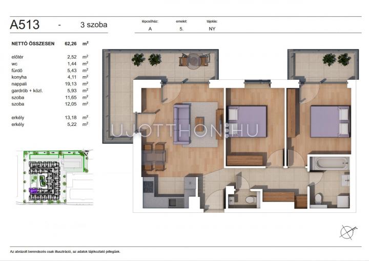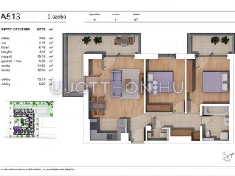 Az ingatlan nettó alapterülete 62,26 m² + 13,18 m² erkély +5,22 m² erkély.