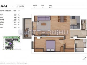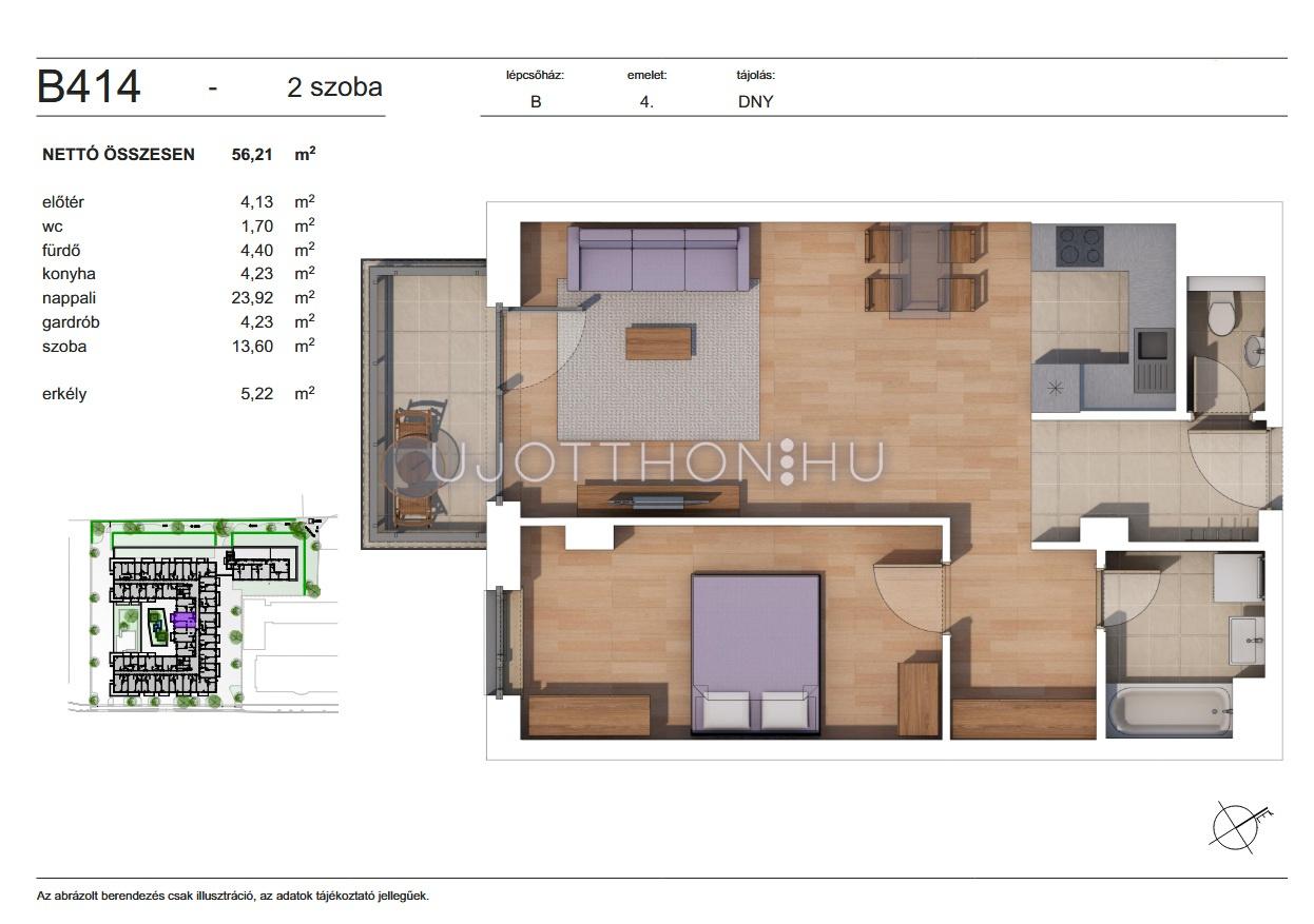 Az ingatlan nettó alapterülete 56,21 m² + 5,22 m² erkély.