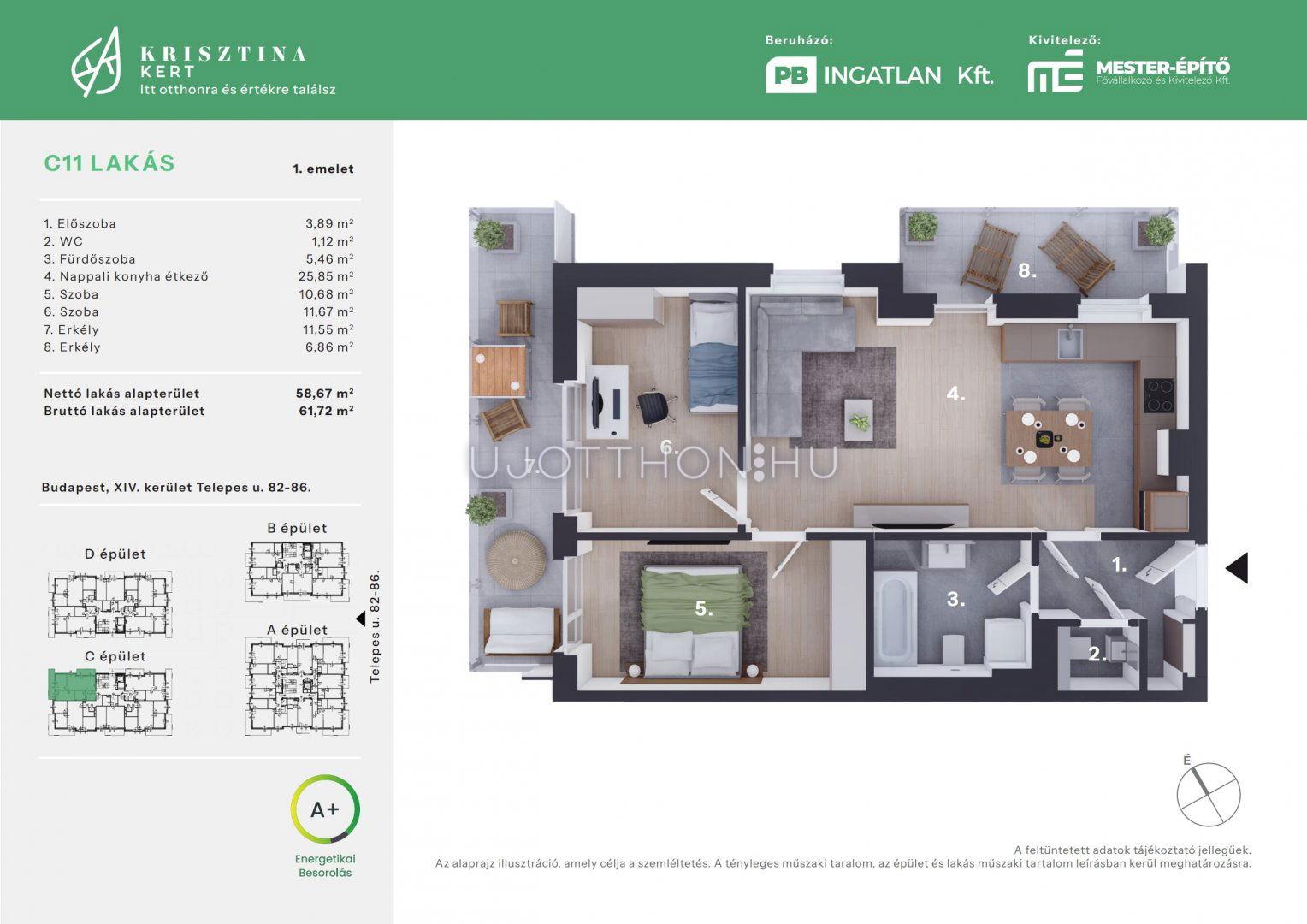1 + 2 félszobás 59 m2-es Lakás Krisztina Kert - Budapest XIV. kerület, Alsórákos, Telepes utca 82-86
