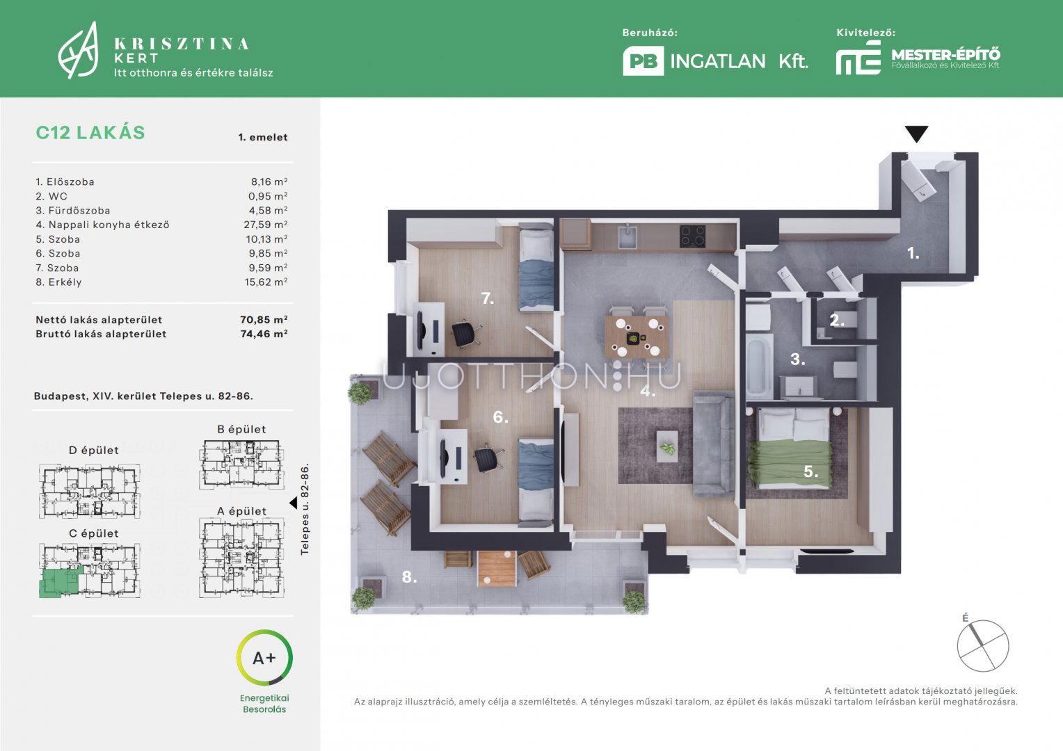 1 + 3 félszobás 71 m2-es Lakás Krisztina Kert - Budapest XIV. kerület, Alsórákos, Telepes utca 82-86