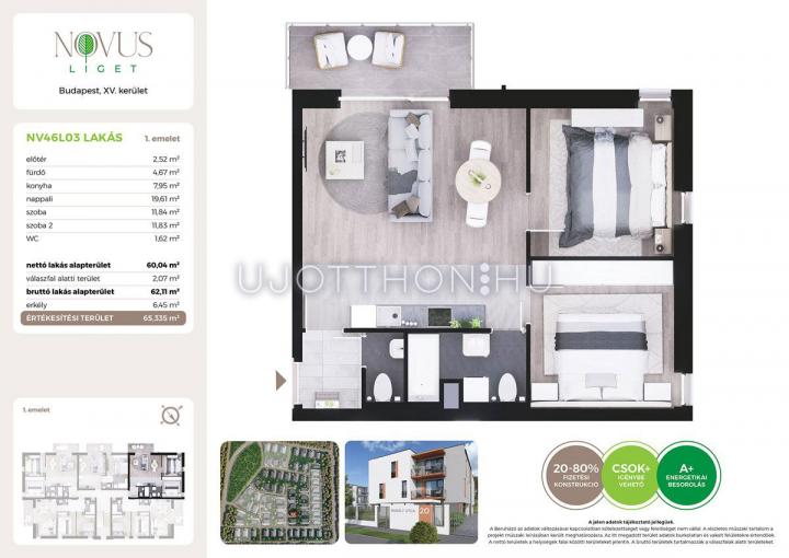 A Novus Liget Budapest 15. kerületének legújabb, modern lakóparkja, amelyet a fenntarthatóság és az élhető környezet jegyében álmodtak meg. A lakóparkban 40 társasház épül, összesen több mint 400, 2, 3 és 4 szobás lakással, amelyek tágas belső tereikkel, kertkapcsolattal vagy terasszal kínálnak kényelmet és nyugalmat. Az A+ energetikai besorolású épületek hőszivattyús rendszerrel és korszerű szigeteléssel készülnek, biztosítva az alacsony fenntartási költségeket és a környezetbarát megoldásokat.