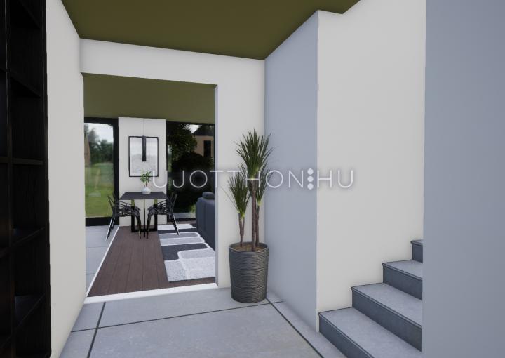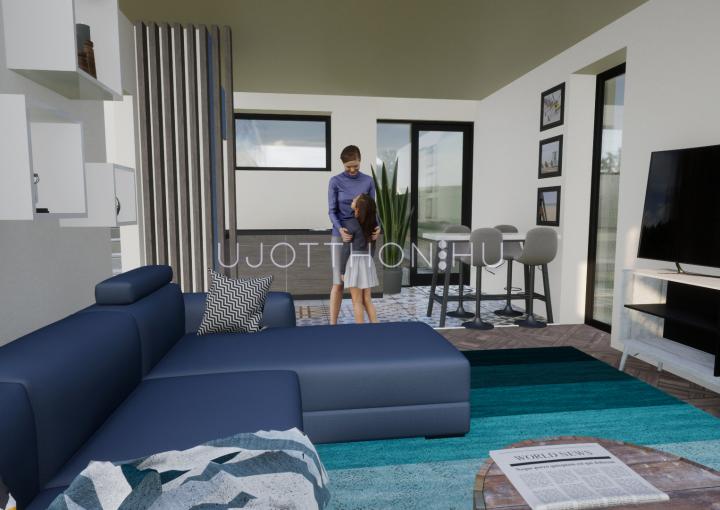 Nappali + 3 szobás, belső kétszintes lakás. A lakáshoz tartozik egy 8 nm-es fedett terasz és egy 6 nm-es tornác is. Az ingatlanhoz tartozik egy kötelezően megvásárolandó gépkocsi beálló, melynek ára 1,5 millió forint valamint saját udvarrésszel is rendelkezik. A lakóparkon belül játszótér, pihenőpark kerül kialakításra.