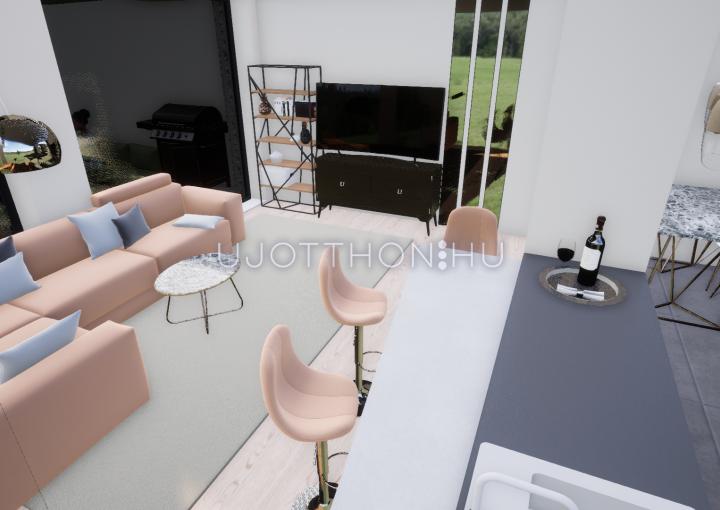 terasz kapcsolódik, mind az étkezőkonyhából, mind a nappaliból önálló kijutási lehetőséget biztosítottunk a teraszra.