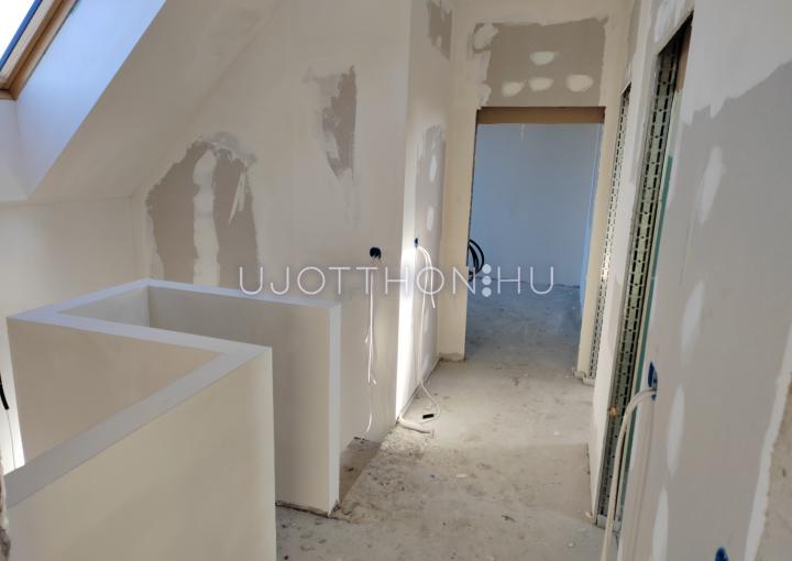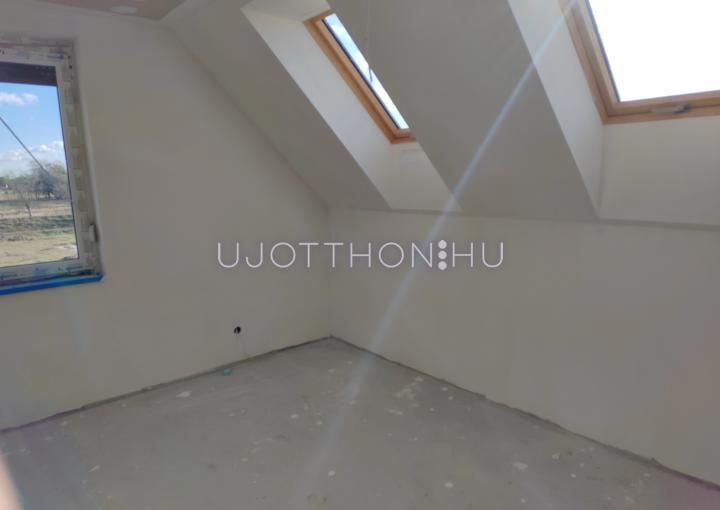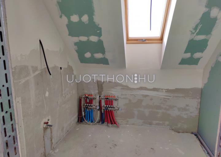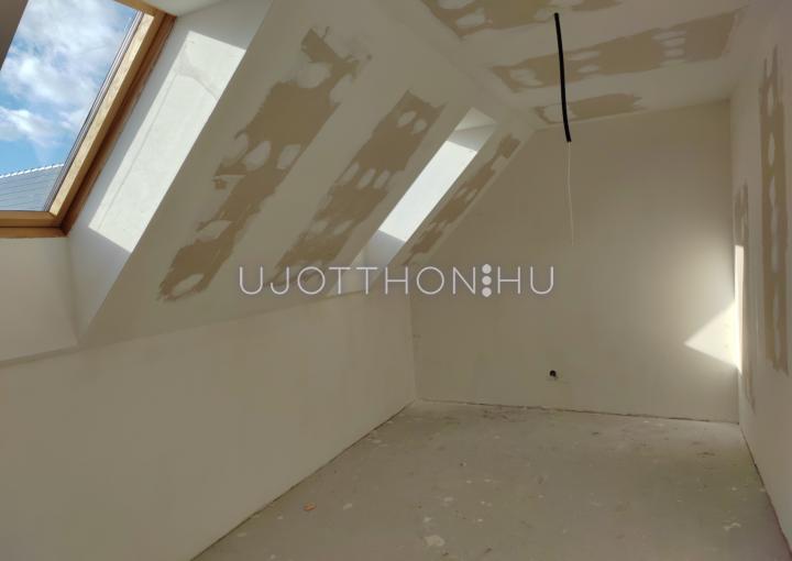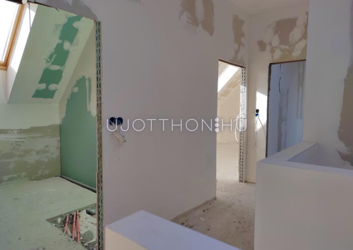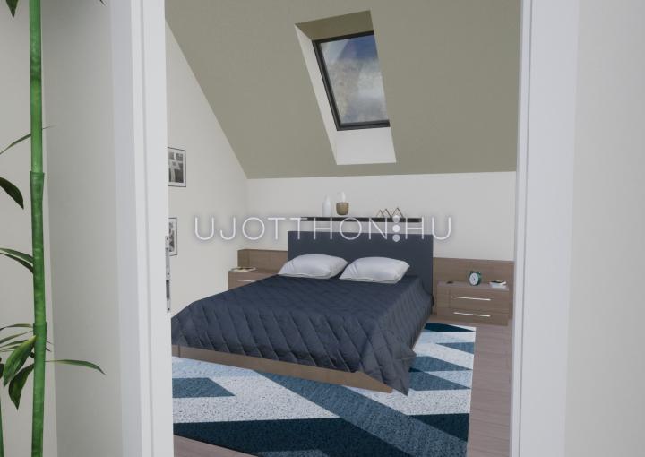 Az emeletre húzottkarú, gipszbeton szerkezetű lépcső vezet fel. Mindkét tetőtéri szobára 2-2 db tetőablakot terveztünk. A lakások