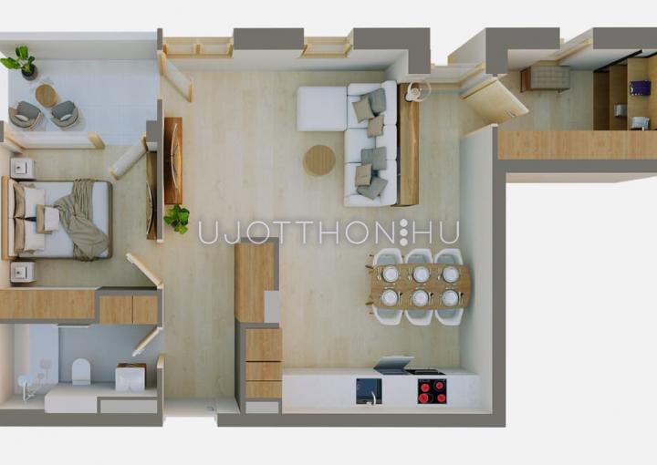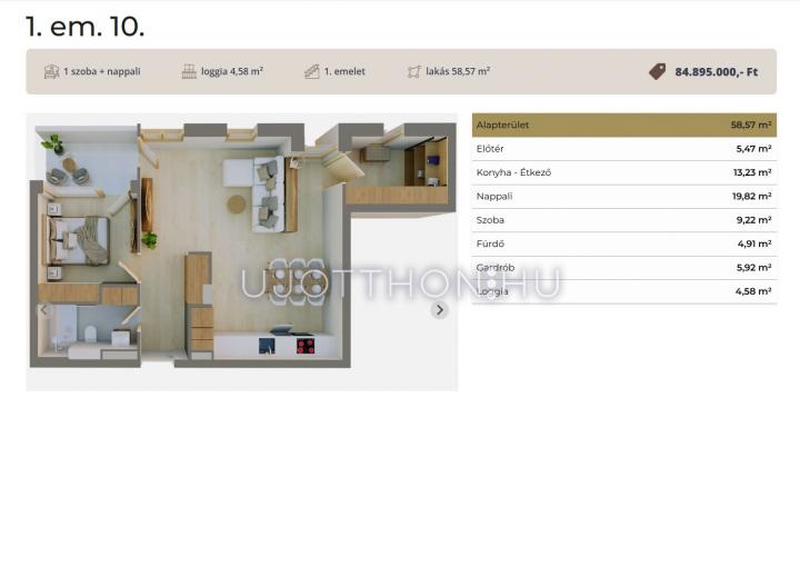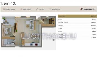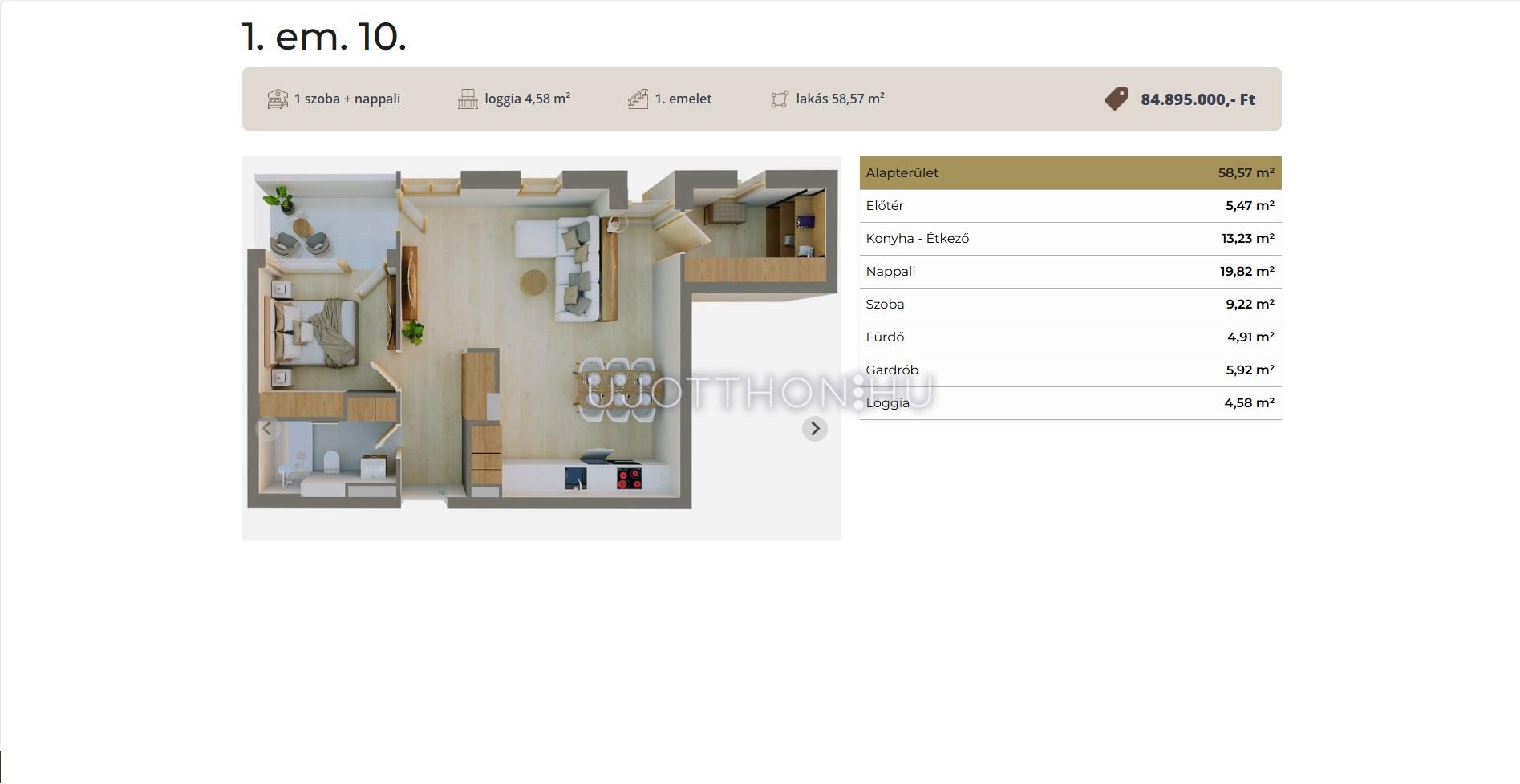 Ez az 1. emeleti lakás 58,57 nm-es, nappali-étkező-konyha +1 szobás, 4,58 nm-es loggiával.