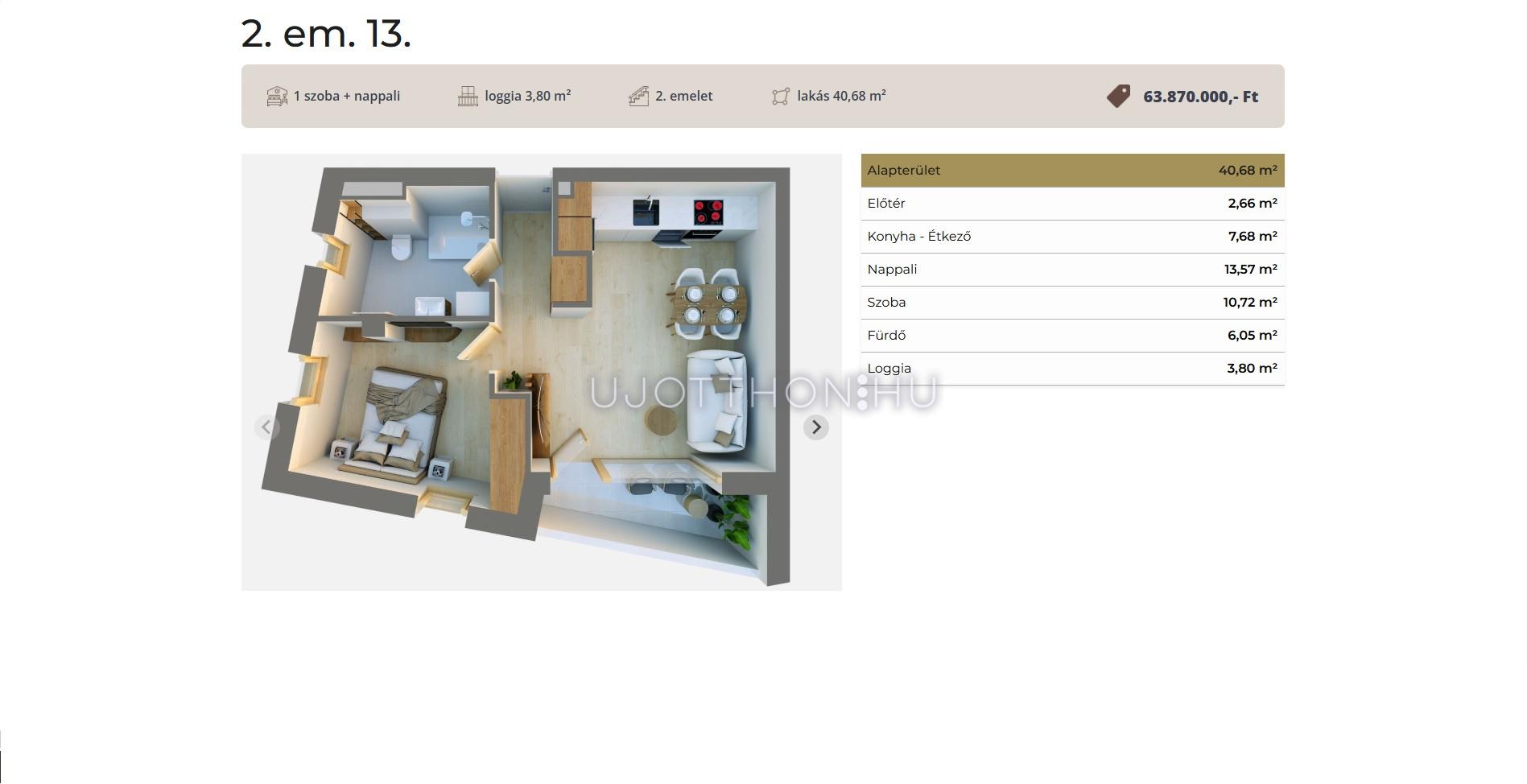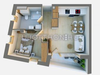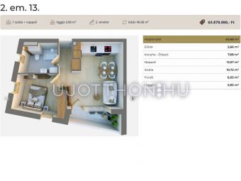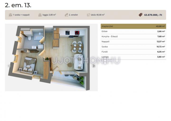 Ez a 2. emeleti lakás 40,68 nm-es, nappali-étkező-konyha +1 szobás, 3,8nm-es loggával.