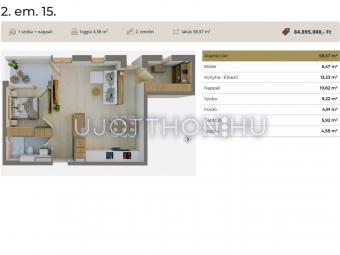 Ez a 2. emeleti lakás 58,57 nm-es, nappali-étkező-konyha +1 szobás, 4,58 nm-es loggiával.