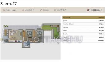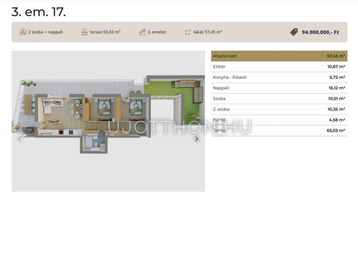 Ez a 3 emeleti penthouse lakás 57,45 nm-es, nappali-étkező-konyha +2 szobás, 65 nm-es tetőterasszal és 32 nm-es.