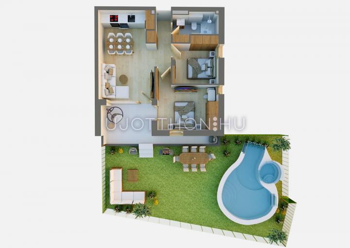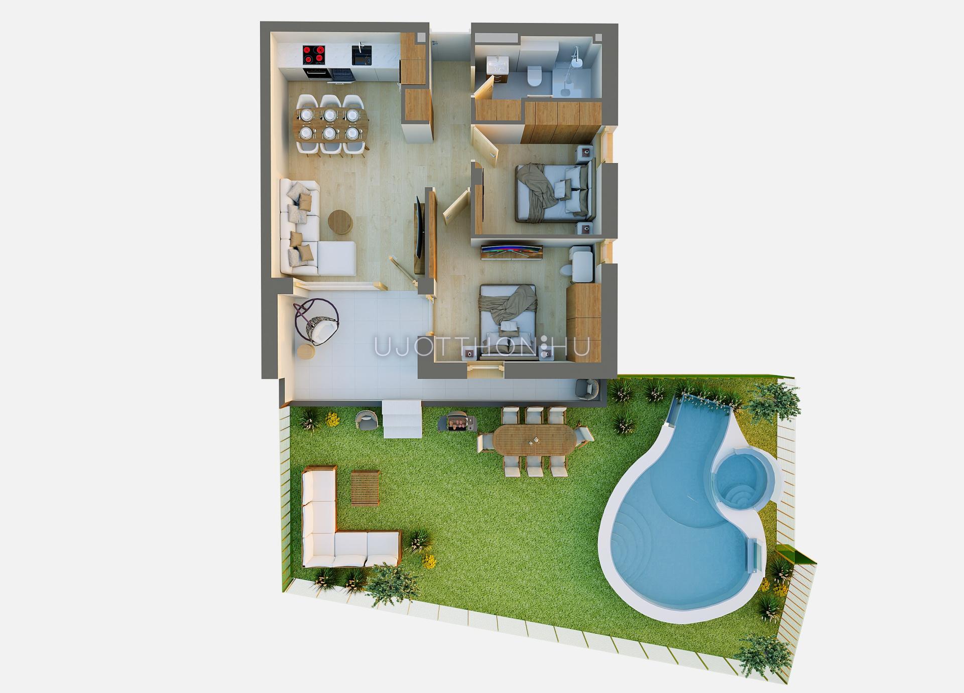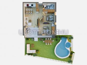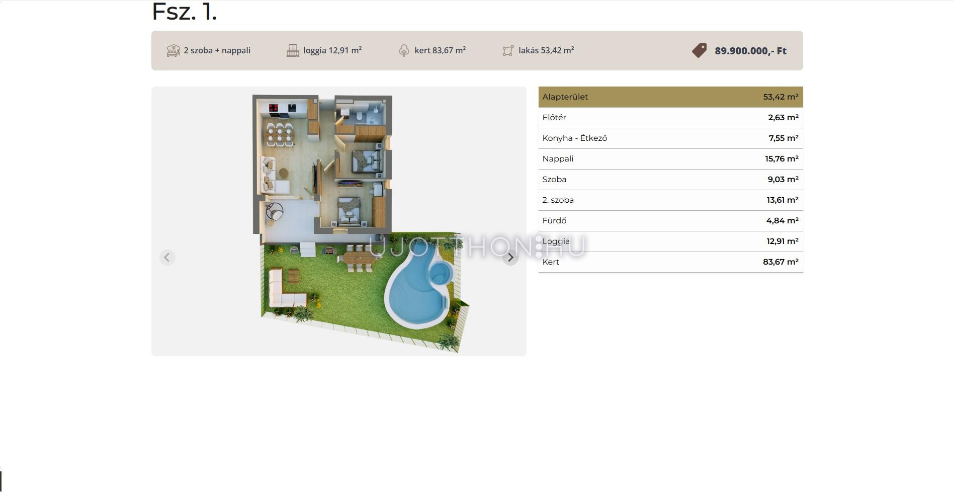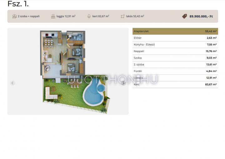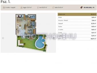 Ez a földszinti kertkapcsolatos lakás 53,42 nm-es, nappali-étkező-konyha +2 szobás, +13 nm-es terasszal és 83 nm-es kerttel.