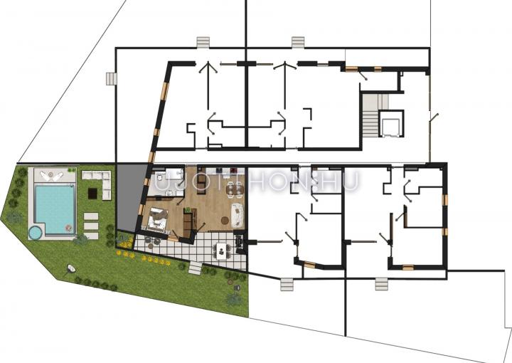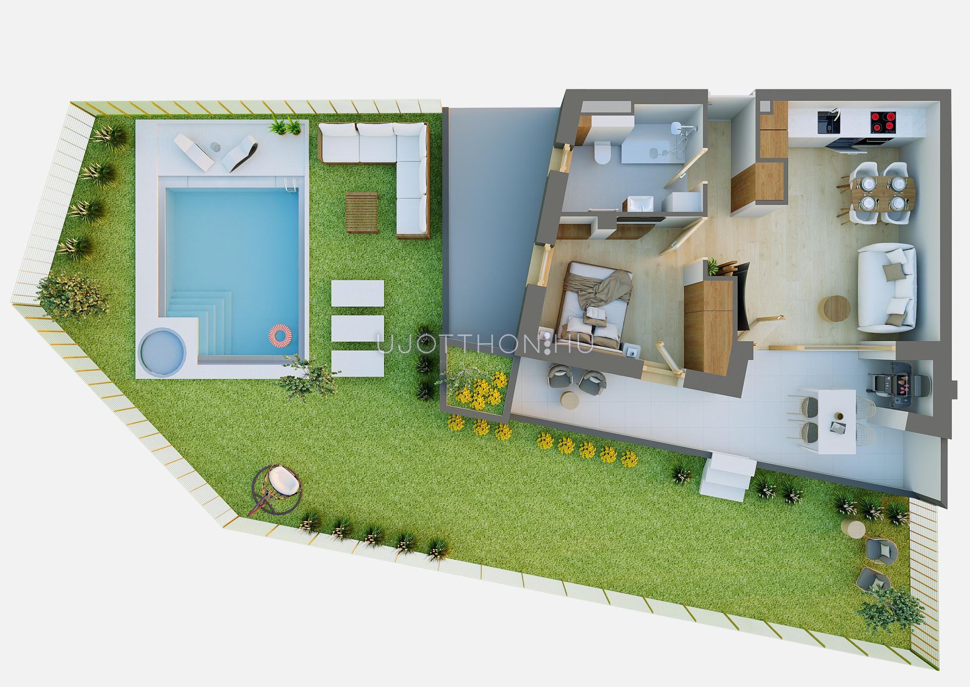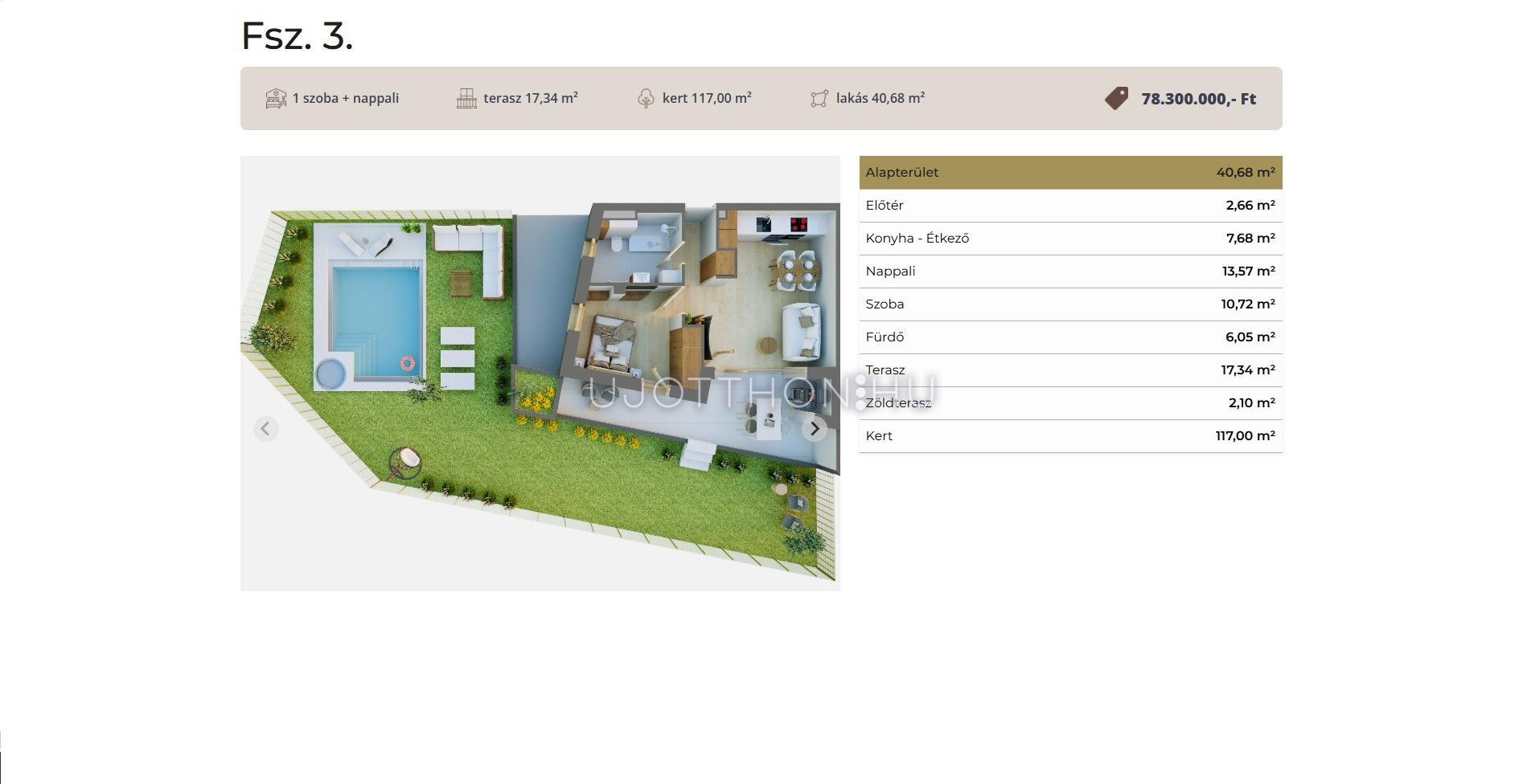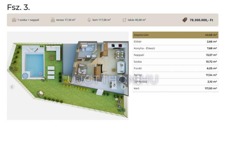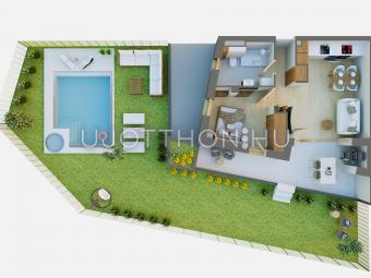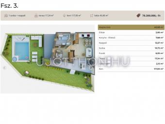 Ez a földszinti kertkapcsolatos lakás 40,68 nm-es, nappali-étkező-konyha +1 szobás, 17 nm-es terasszal és 117 nm-es kerttel.