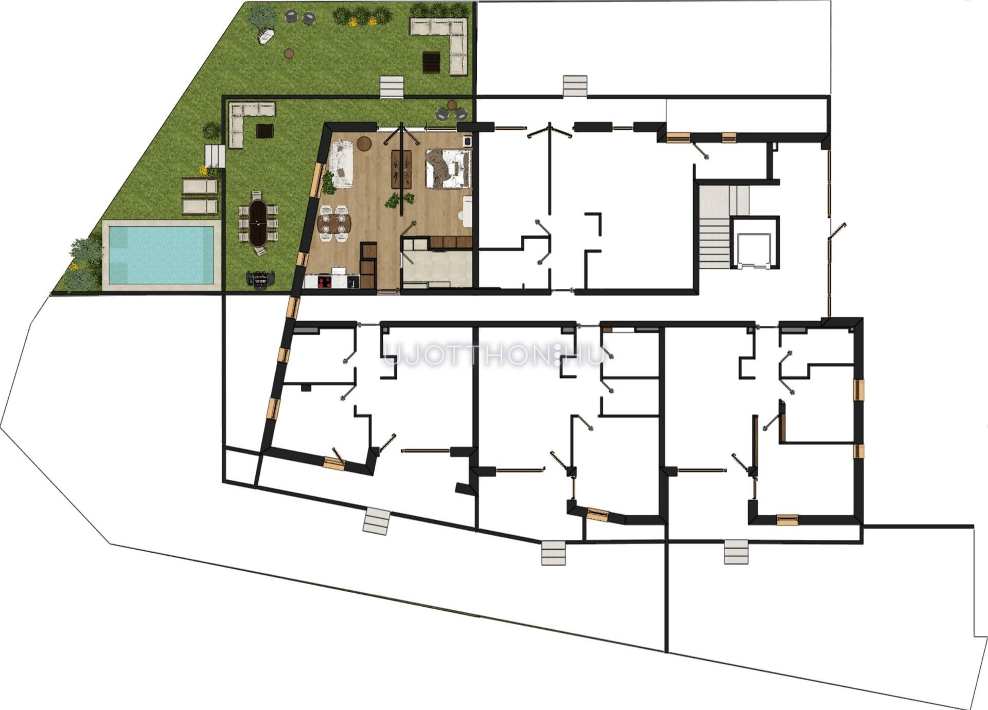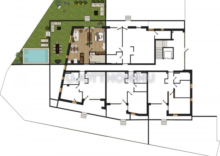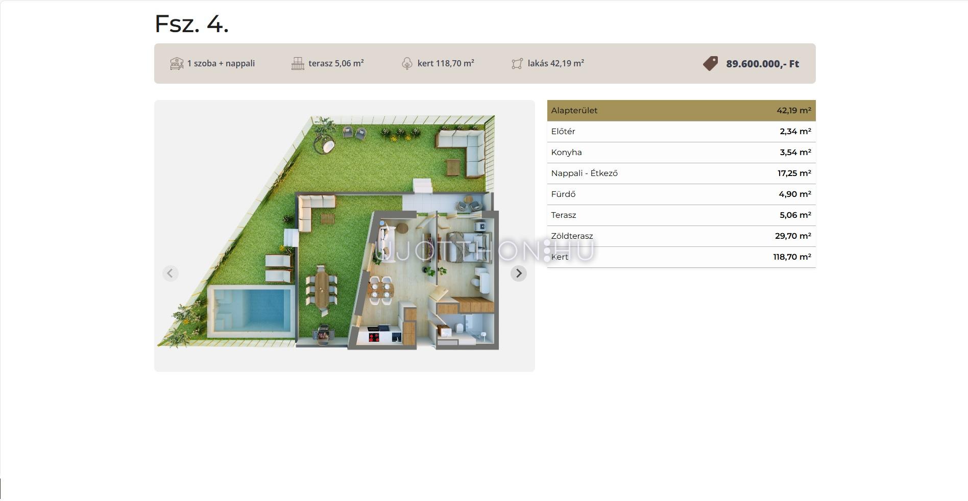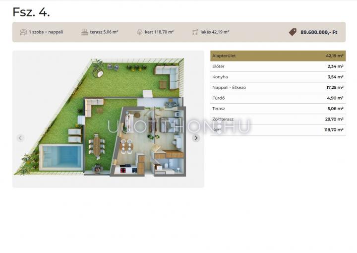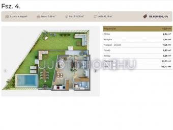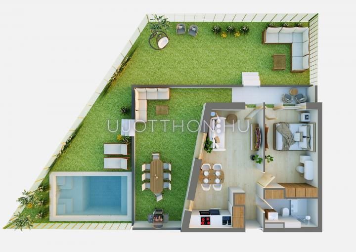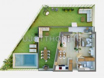 Ez a földszinti kertkapcsolatos lakás 42 nm-es, nappali-étkező-konyha +1 szobás, 5 nm-es terasszal és 148 nm-es kerttel.