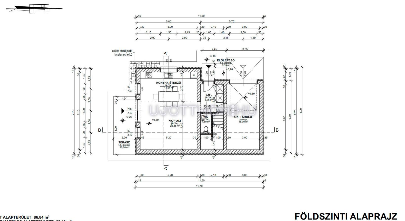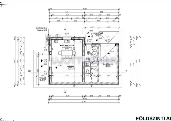 Földszint helyiségei : konyha - étkező - nappali, + terasz + garázs