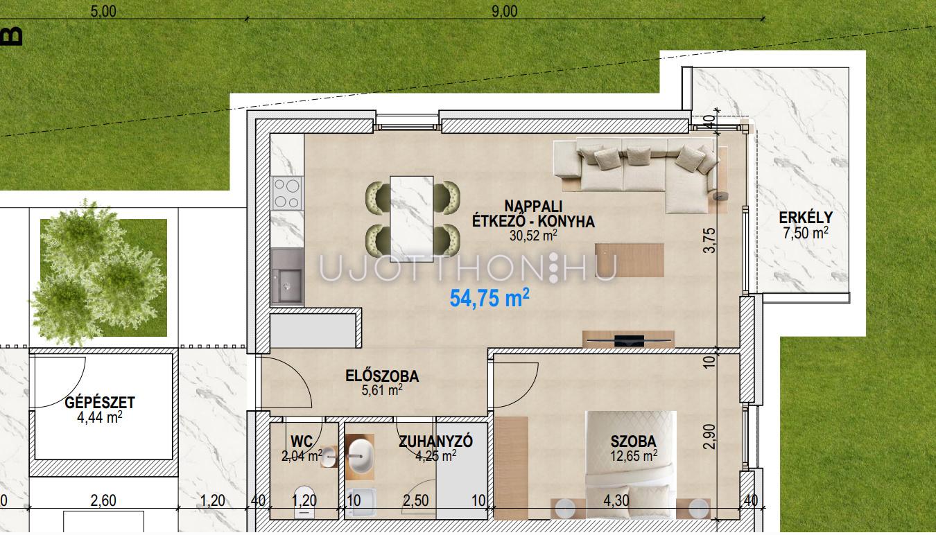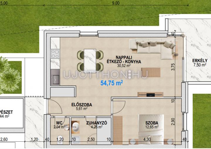 Az ingatlan az 1. emeleten helyezkedik el, 54,75 m2 alapterületű + 7,5 m2 erkély tartozik hozzá.
