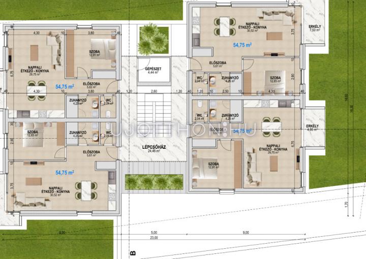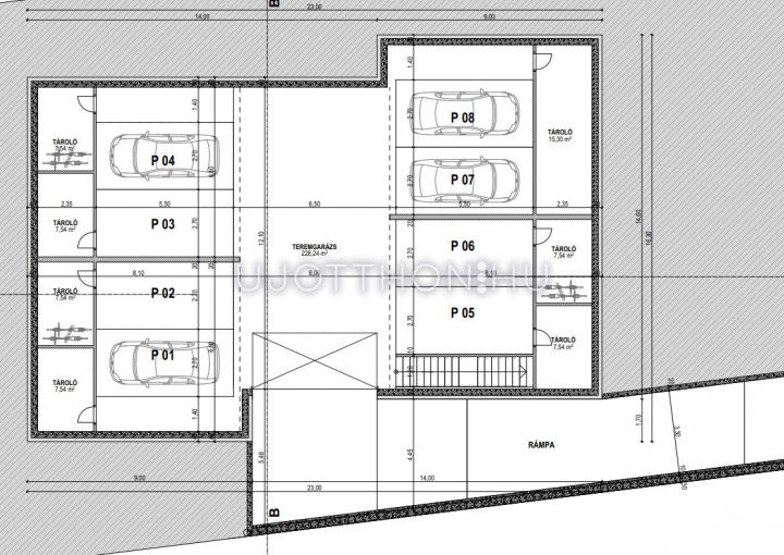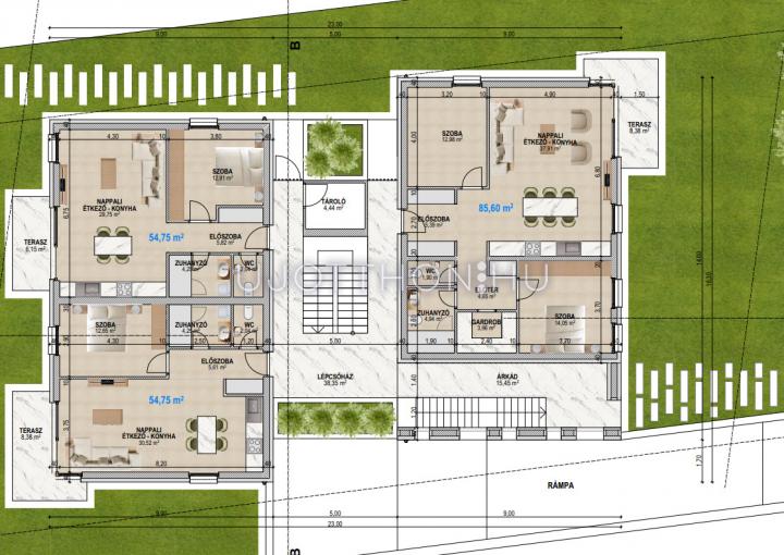 7 lakásos társasház, földszint + emeleti kialakítással, garázsok pince szinten .
