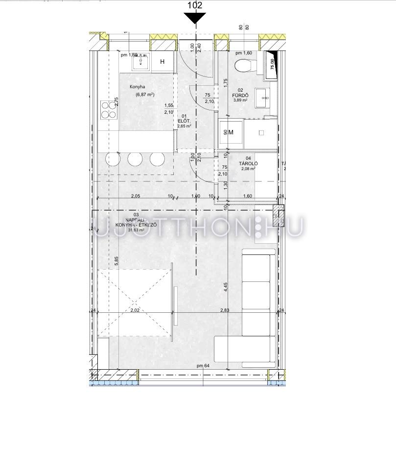 Ez az 1. emeleti lakás 40,25 nm-es, nappali-étkező- amerikai konyhás.
