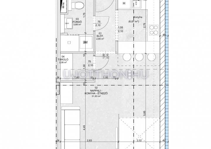 Ez az 1. emeleti lakás 40,25 nm-es, nappali-étkező-konyhás.