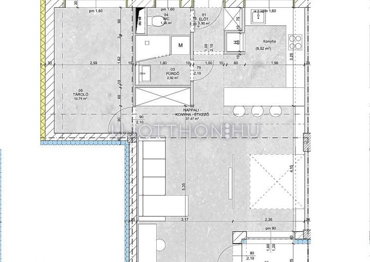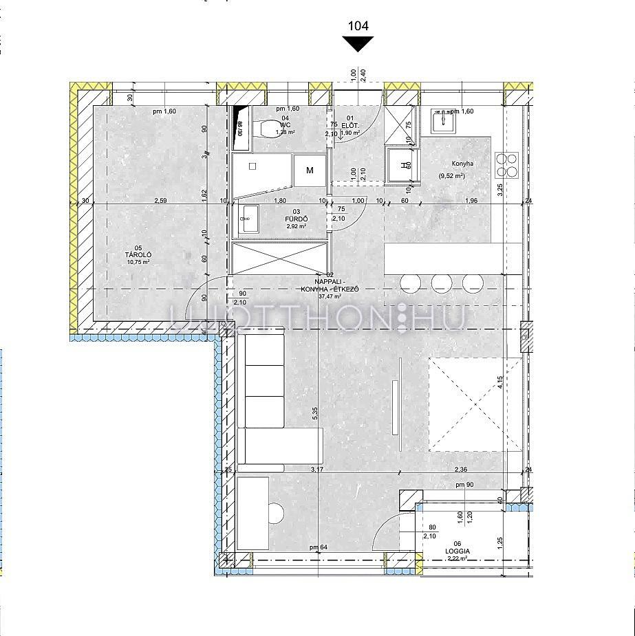 Ez az 1. emeleti lakás 54,32nm-es, nappali-étkező konyha +1 szobás, 2,22 nm-es loggiával.
